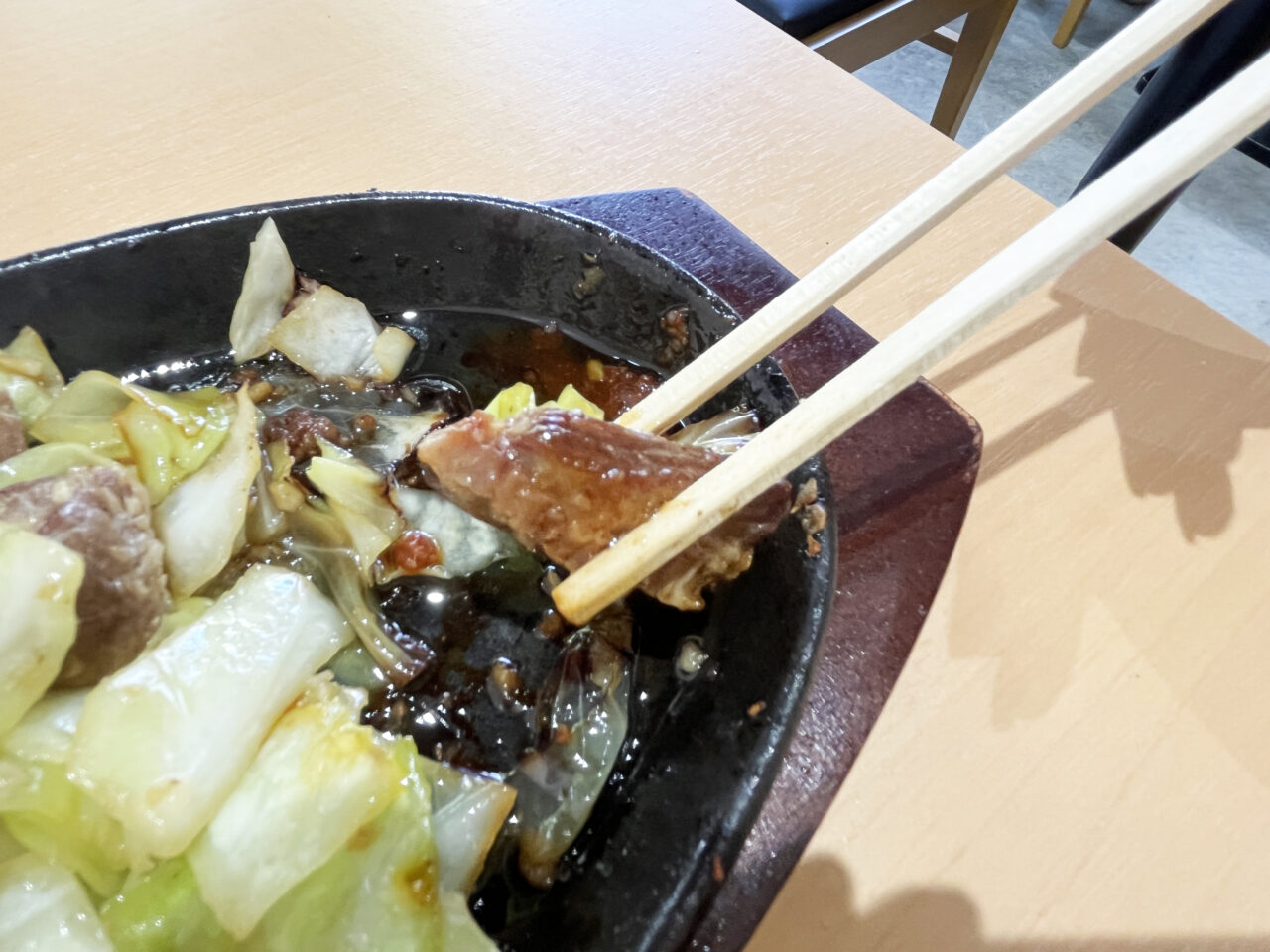 こちらが「枕木」ですね。鉄板の下に「枕木」を置いて鉄板を傾けて、たまった油に特製辛味噌を溶かして、さらに美味しさがステップアップできます。