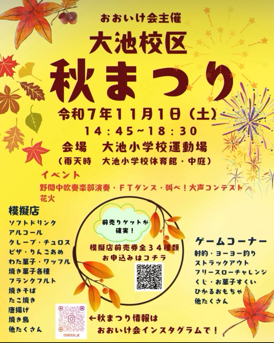 - 大池校区秋まつり 2025年11月1日(土) 14時45分 会場:大池小学校