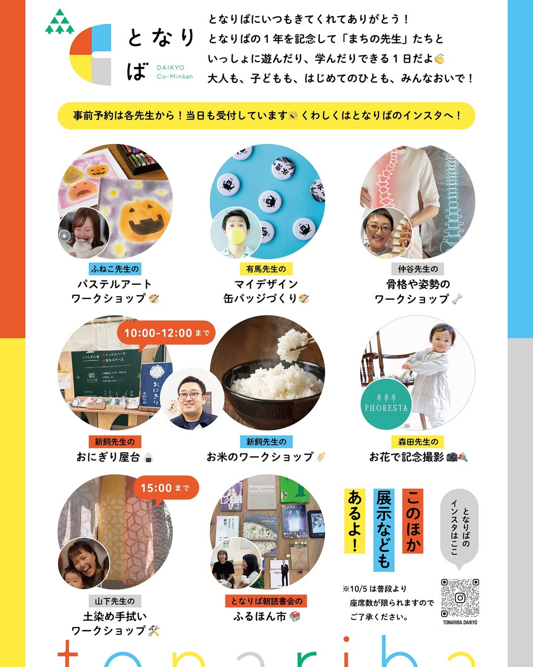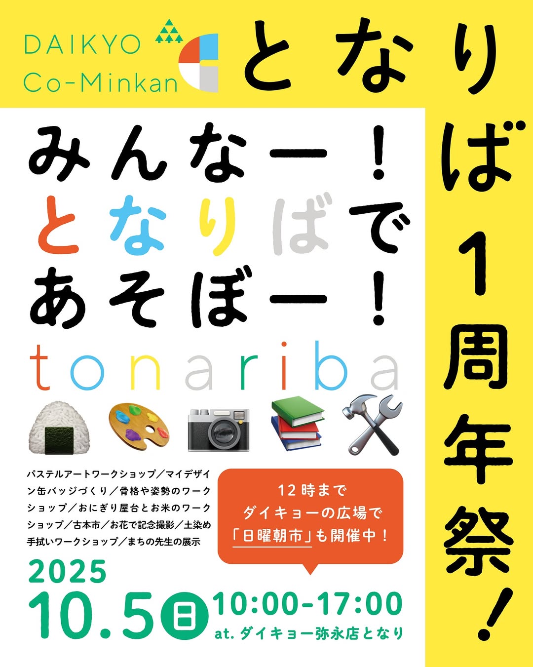 人気スーパー「ダイキョーバリュー」が運営するみんなのための私設公民館「となりば」が2025年10月で1年を迎え、1周年祭を開催されます!1周年おめでとうございます♪