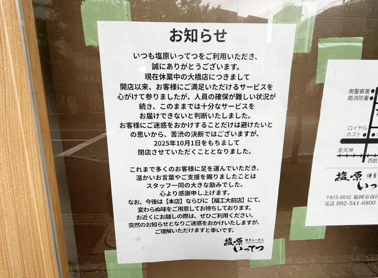 店頭には閉店をお知らせする貼紙が。2025年10月1日をもって閉店となったそうです…。
