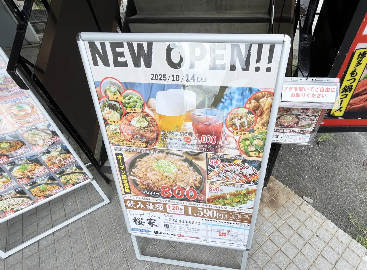 すでに開店告知が置かれていました。2025年10月14日にOPENするそうです!「桜家」は東区馬出にある鉄板焼きが楽しめる居酒屋で清水店は2号店となります。