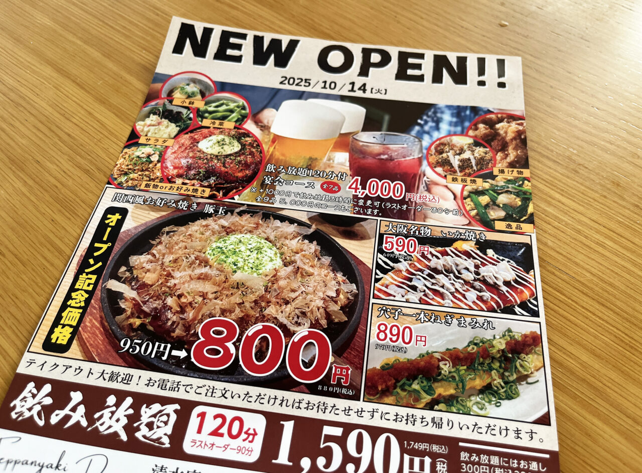 置かれていたチラシをもらってきました。「関西風お好み焼き 豚玉」が通常税込950円のところ、オープン記念特価で税込800円になるようですよ♪