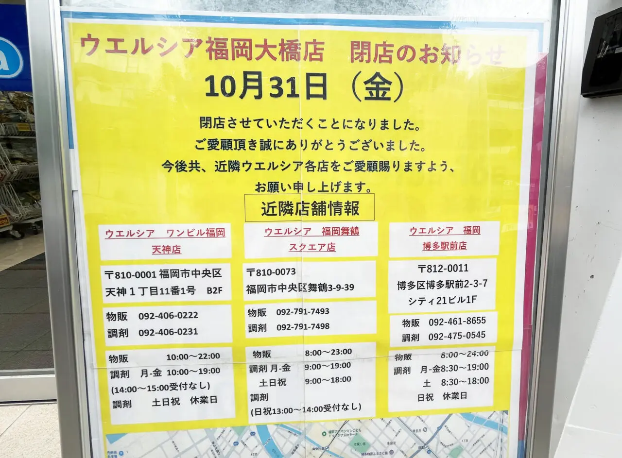 大橋駅近くにある「ウエルシア福岡大橋店」が閉店します。