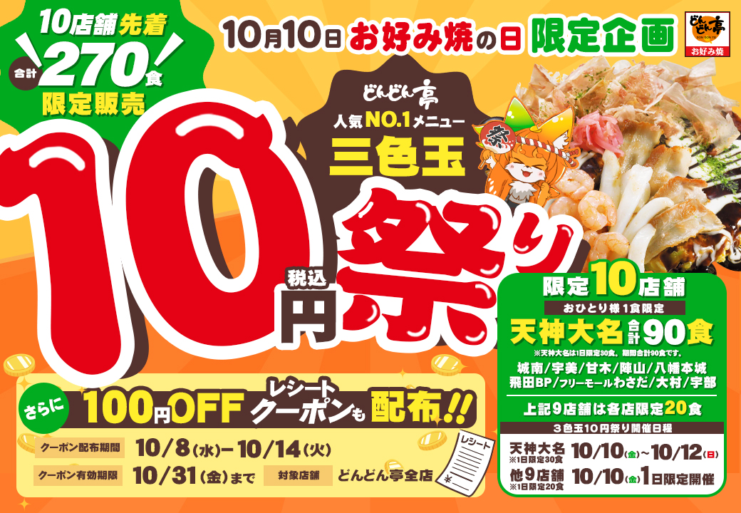 「お好み焼専門店どんどん亭」にて「お好み焼の日」を記念した限定イベント「三色玉10円祭り」では、人気No.1お好み焼「三色玉」通常価格890円のところ、数量限定でなんと特別価格税込10円で提供される衝撃企画です。45店舗中10店舗限定開催となっており、福岡市では「天神大名店」と「城南店」で限定販売されます。(公式サイト)