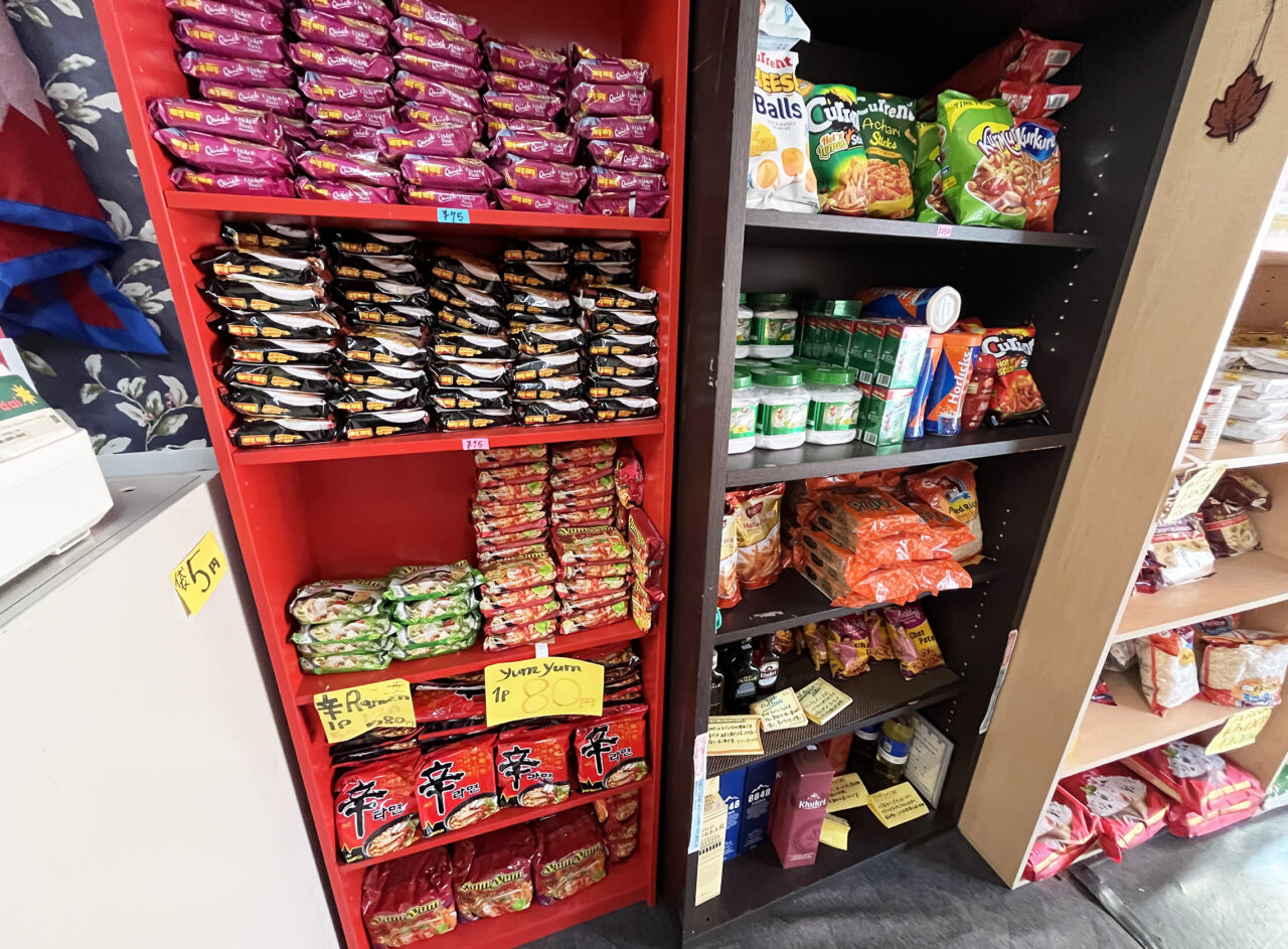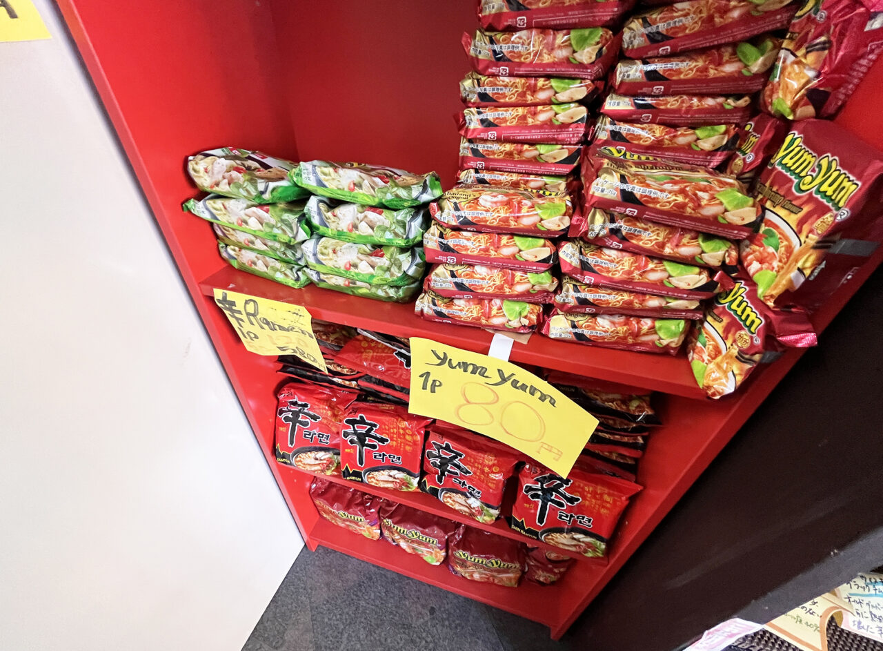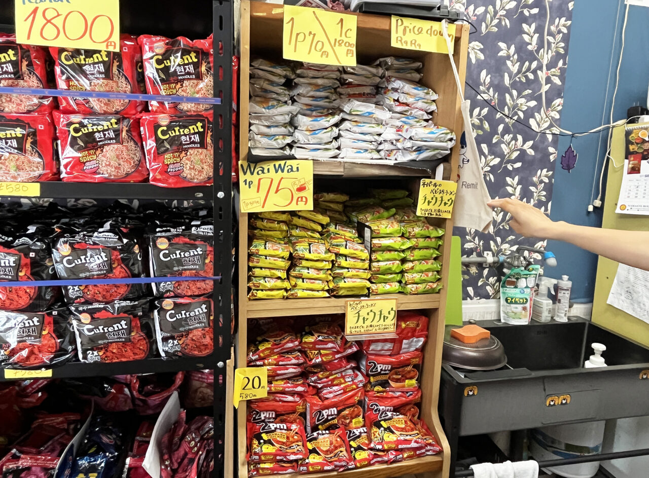 そのほかタイや韓国の即席麵も販売されています。隣の棚にはスナック菓子などのお菓子なども販売されていました。