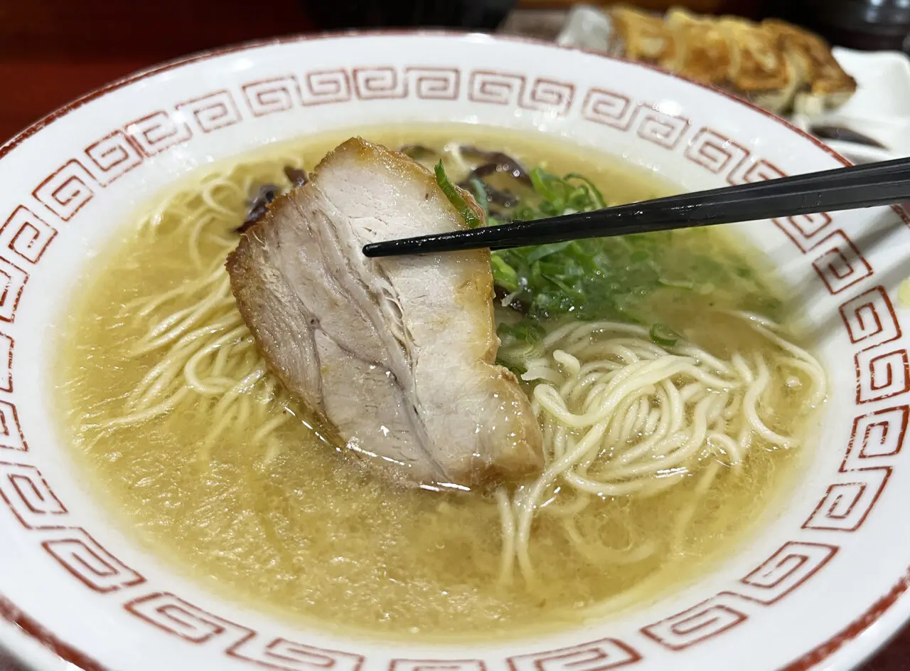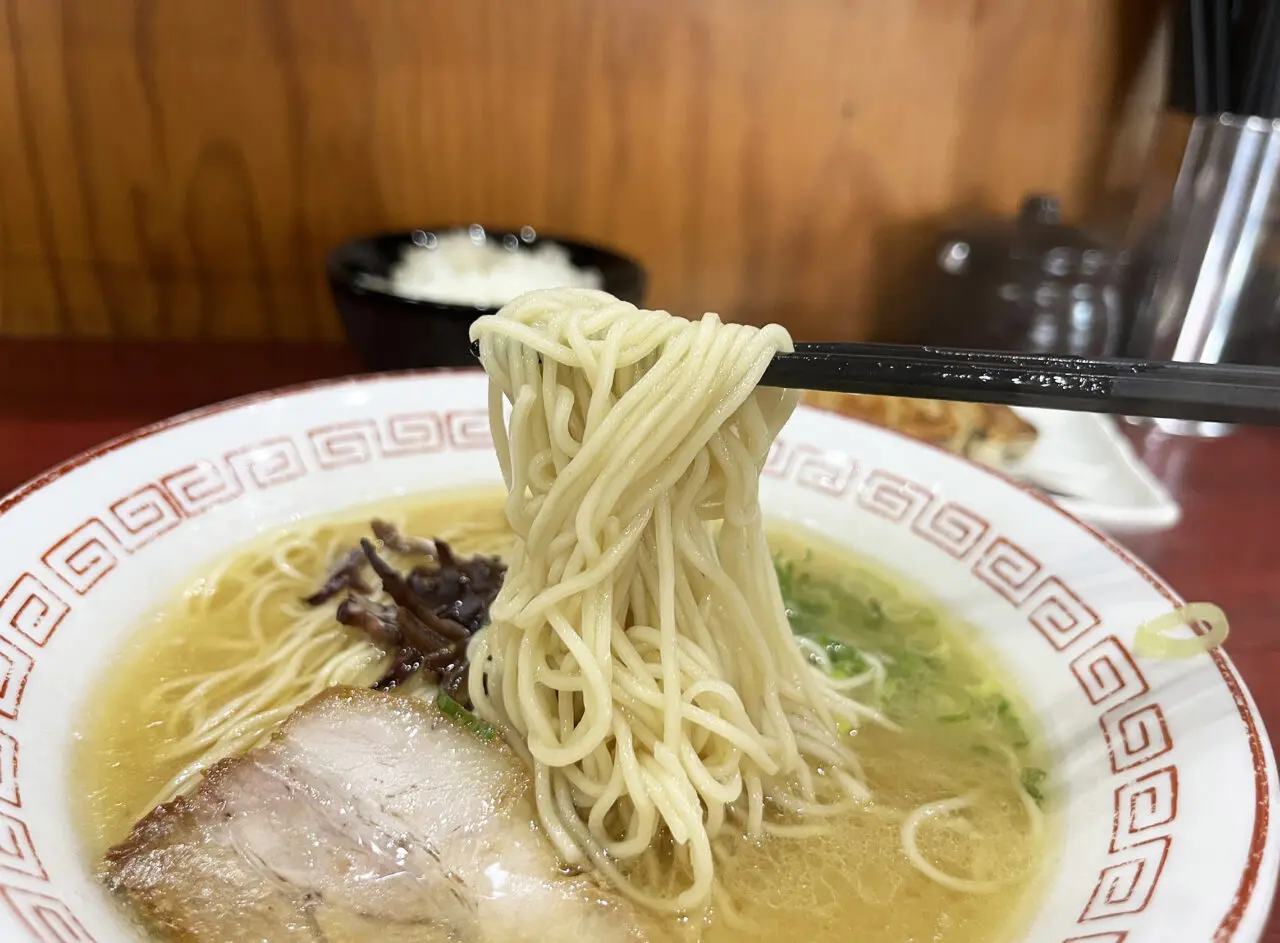 一口食べると濃厚な豚骨の香りが鼻から抜け、こってりとした豚骨スープに細麺が絡んで最高の味わいです!