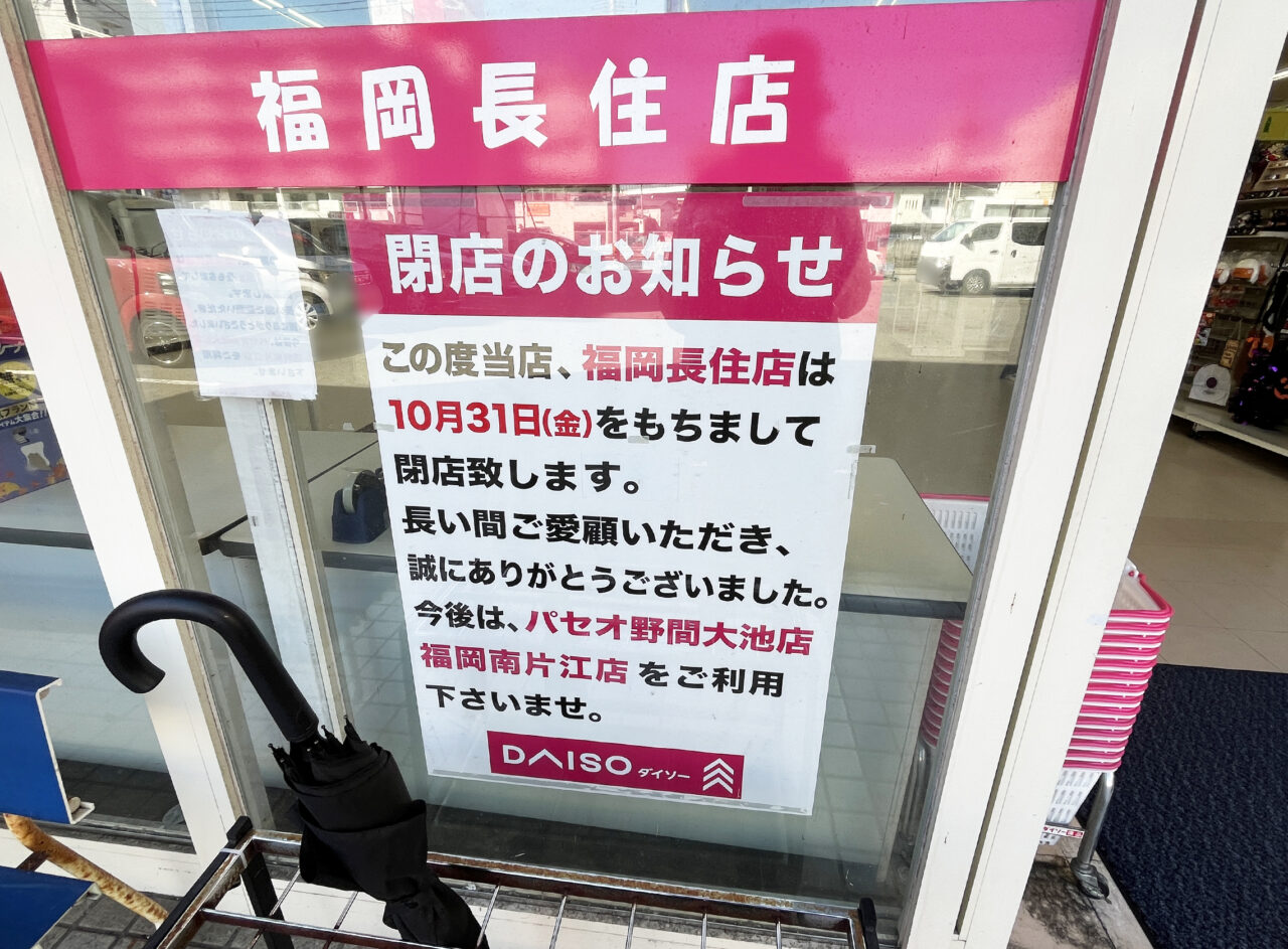 「ダイソー 福岡長住店」が閉店するという驚きの情報が入って来ました。