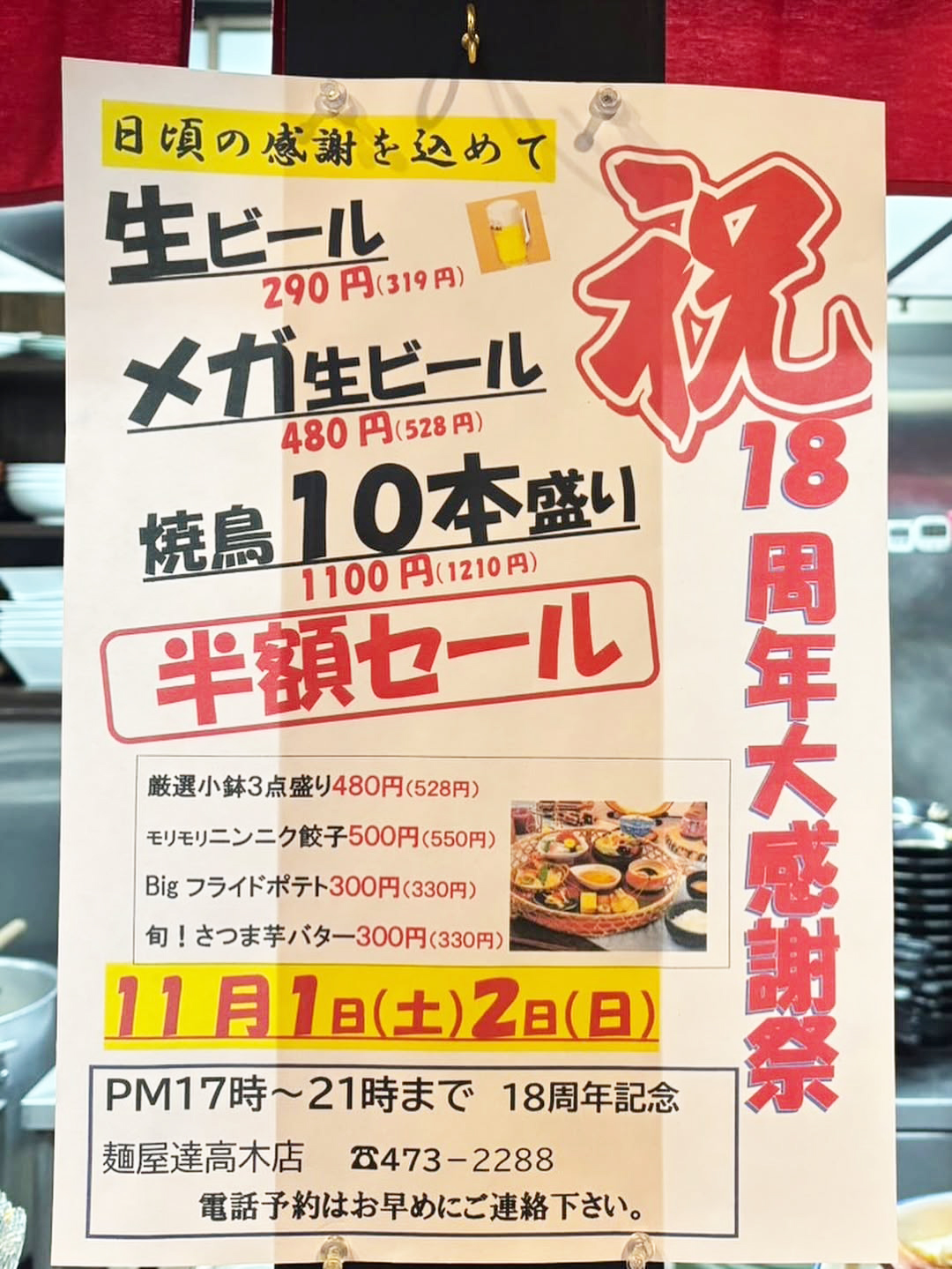 「麺屋 達 高木店」では「18周年 大感謝祭」を11月2日まで開催中です。「生ビール」「メガ生ビール」のほか「焼鳥10本盛り」が半額セールとなっていますよ。