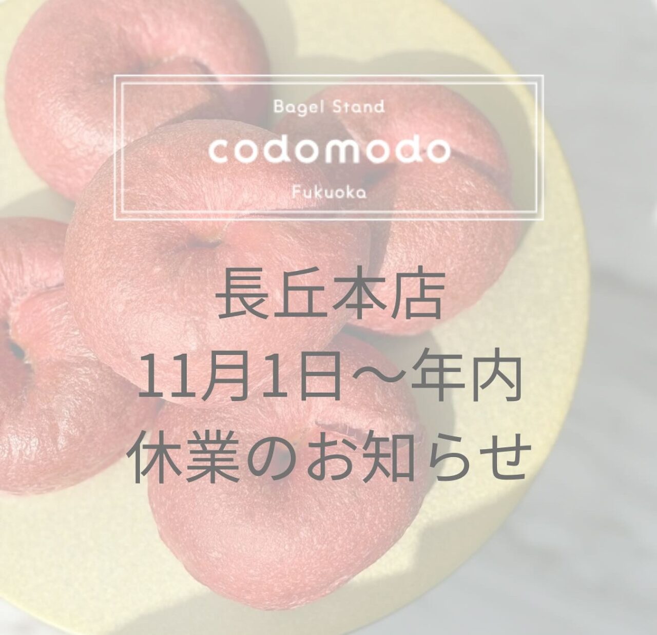 長丘のベーグルショップ「codomodo 長丘本店」が2025年11月1日より、年内休業すると公式SNSでお知らせされています。気になる理由は「新しいチャレンジをするため」と書かれていました。