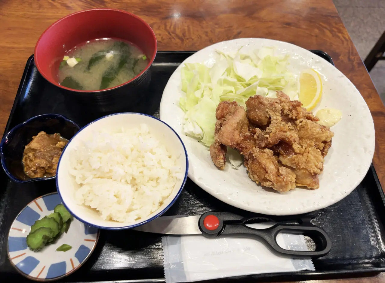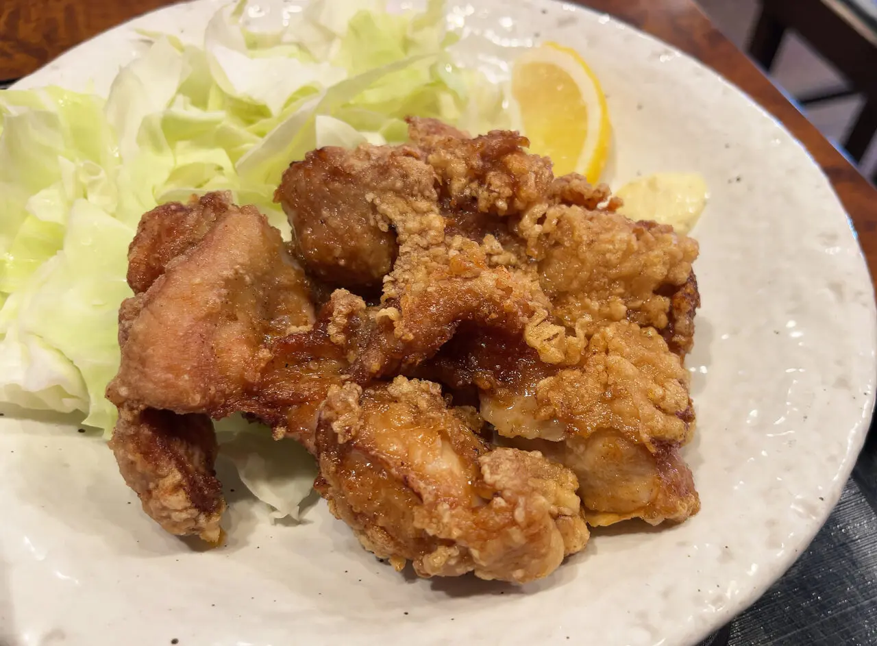 とても大きな鶏もも肉の一枚揚げお目見え!キッチンばさみが添えられてきたので、食べごろな大きさにお好みで切って頂きました!外はカリっと中はジューシーな鶏もも肉。しっかり味が染みていてとても美味しかったです。