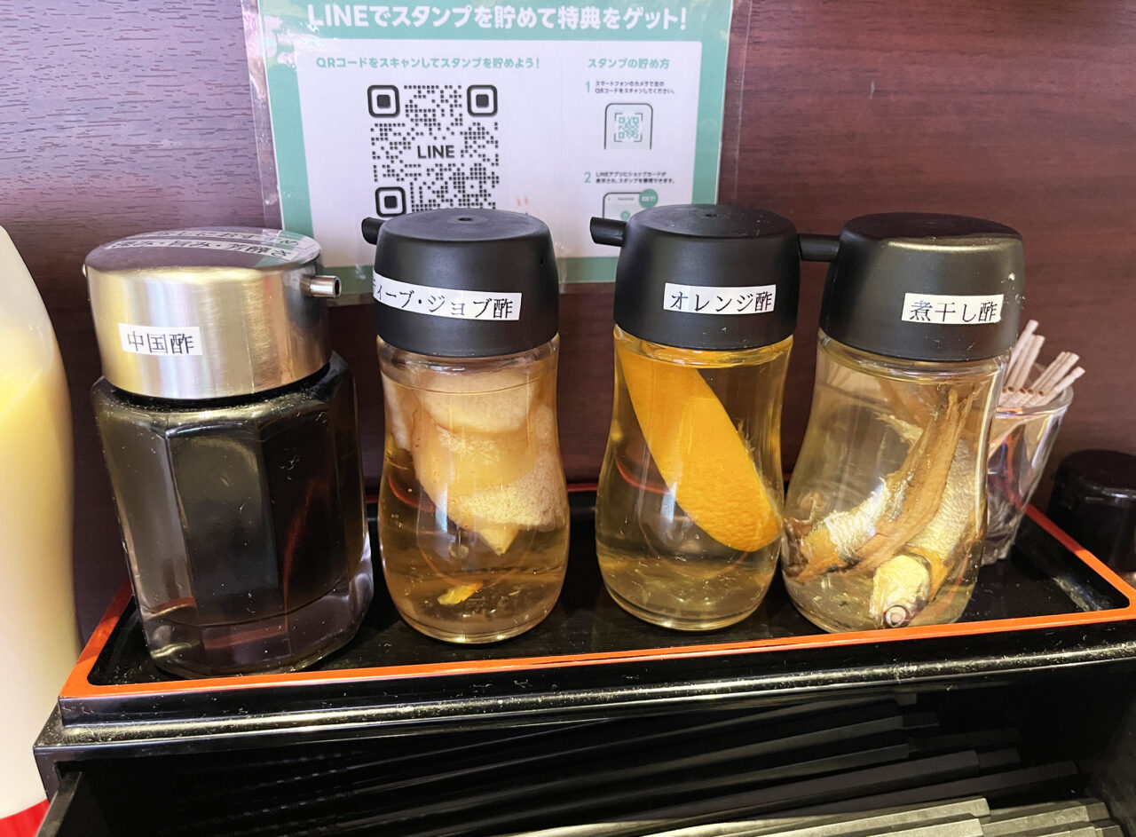 味変用のお酢は4種類展開で、中国酢やスティーブジョブ酢(リンゴ酢)など気になるものも。