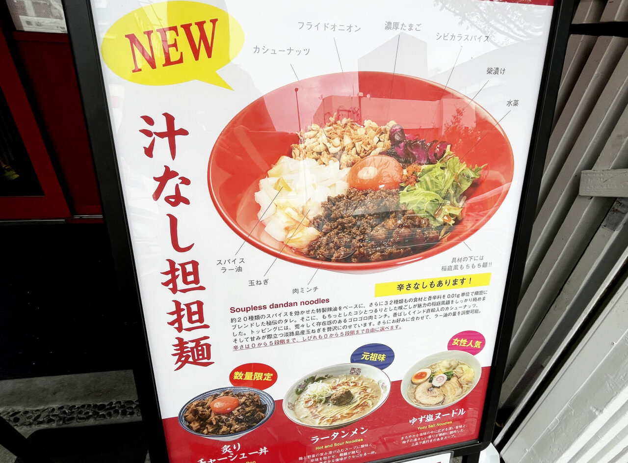 新メニューには「汁なし担担麺」のほか、「ゆず塩ヌードル」「貝だしワンタンヌードル」なども登場しています。もちろん創業の味「ラータンメン」も変わらない人気を誇っているとの事でしたよ。