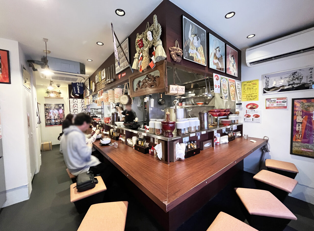 BGMに祭囃子が流れる活気のある雰囲気の店内。カウンター席のみとなっています。