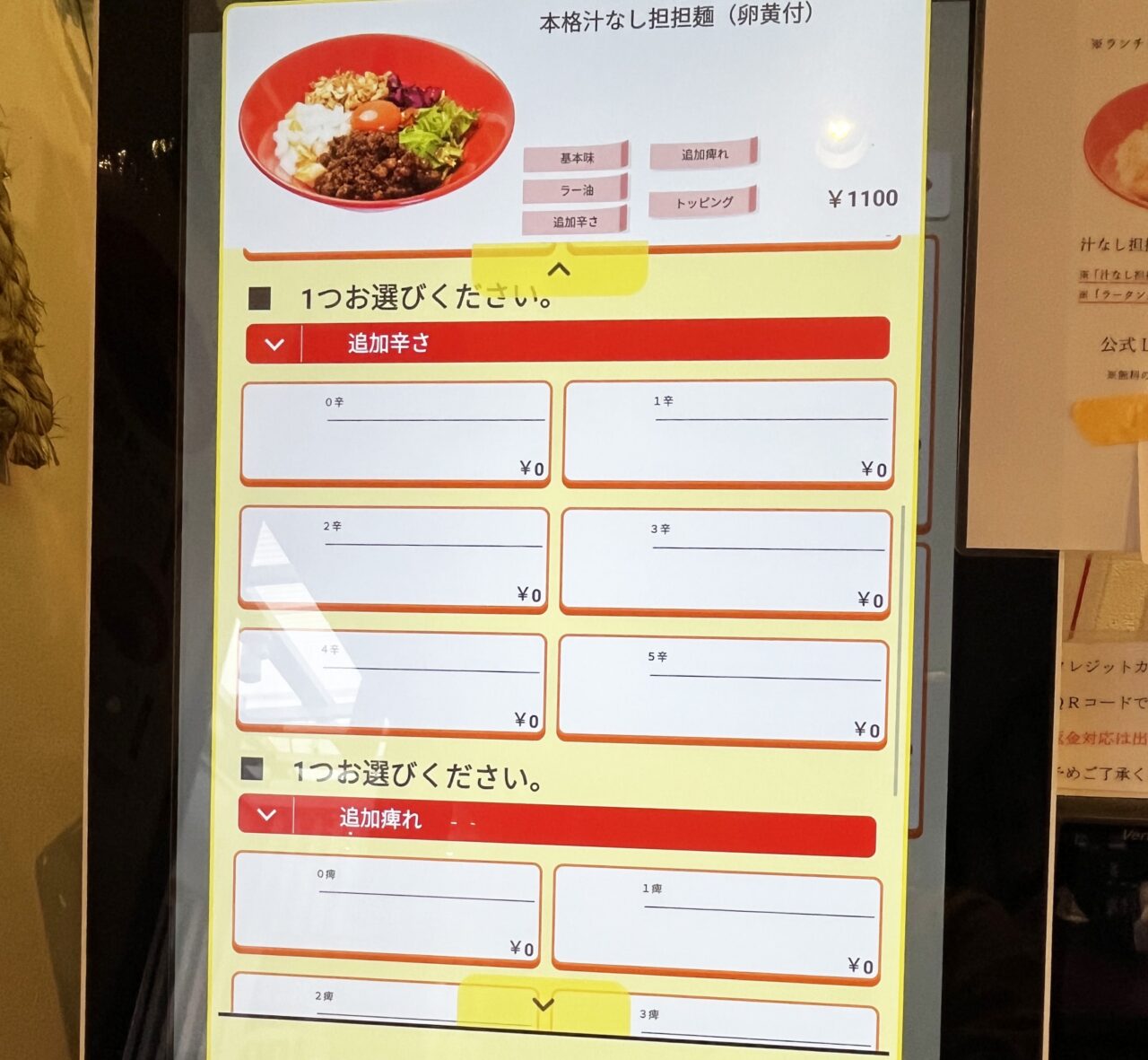 タッチパネル式のセルフレジで注文します。辛さや痺れ(山椒)を1~5段階で注文可能です。お好みの辛さに調整できるので辛いのが苦手な方にも安心なシステムとなっています♪支払い方法は現金ほかクレジットカードなどの電子決済も可能です。