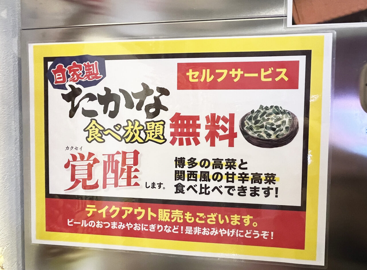 セルフサービスで「高菜」の食べ放題がなんと無料! 博多の高菜と関西風の甘辛高菜の食べ比べもぜひ。