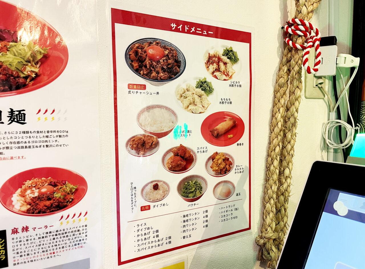 麺類以外にもサイドメニューには「炙りチャーシュー丼」「水餃子」や「春巻き」などお腹いっぱいになりそうなガッツリ系メニューが充実。夜に夕食としてお腹いっぱい食べたい方にもオススメ♪