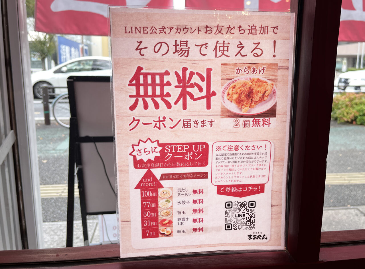 友だち追加するとその場ですぐ使えるオトクなクーポンもあるので、直接スタッフの方にお問い合わせ下さい。また「まるたんLINEショップカード」の来店スタンプを貯めると「替玉無料」クーポンなどももらえますよ。この機会にぜひご活用下さい!