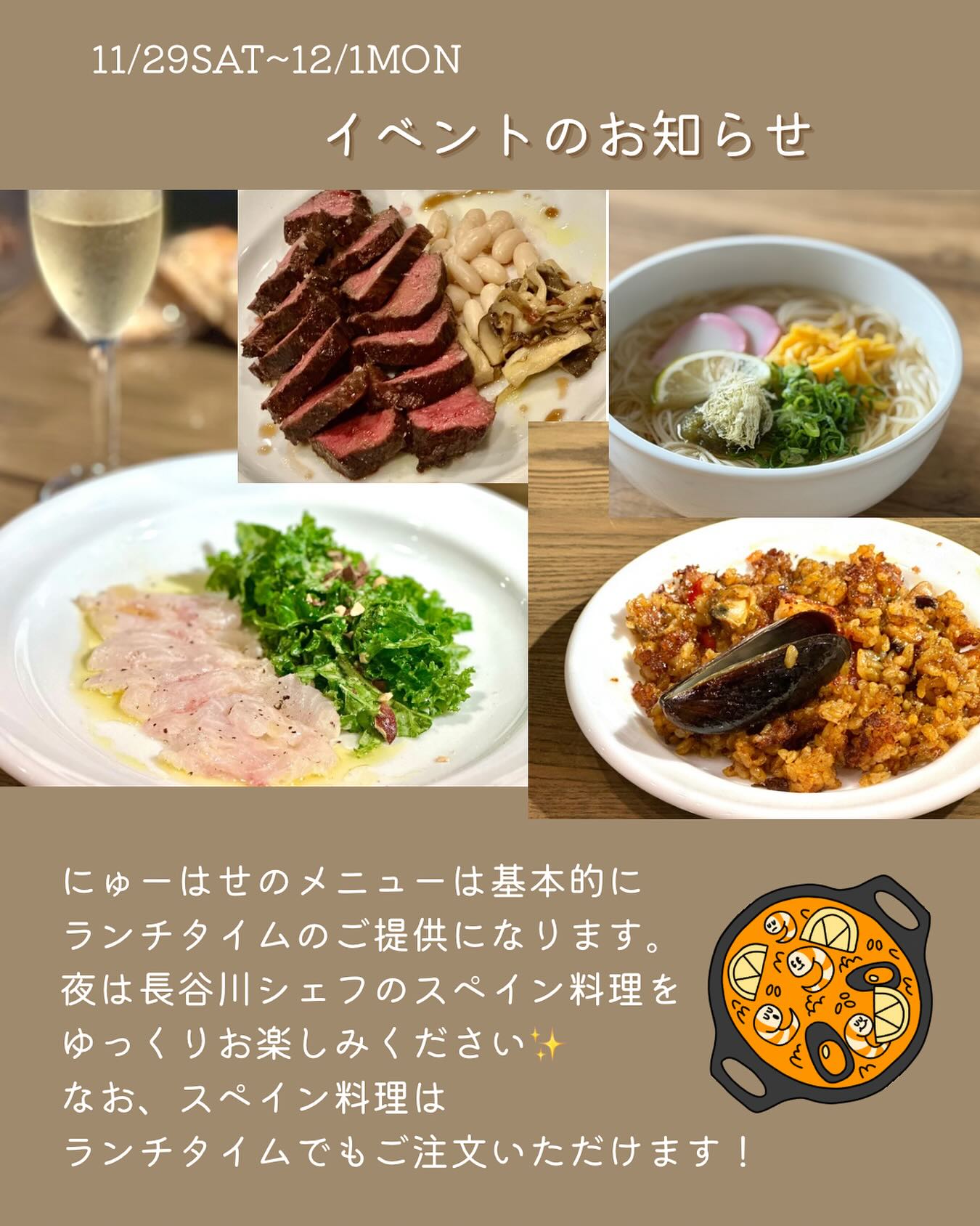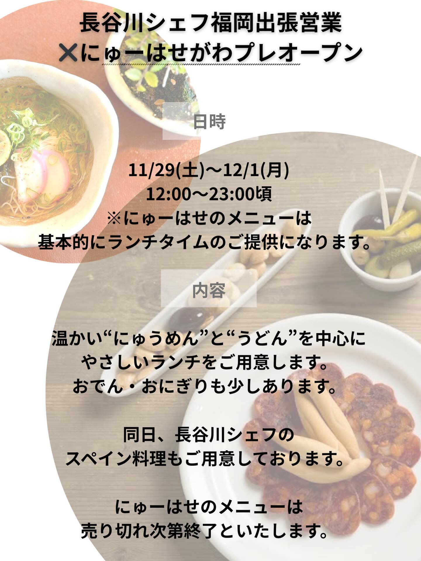 - 提供内容:”にゅうめん”“うどん”を中心とした「あったか麺ランチ」やおでんなど。長谷川シェフのスペイン料理も提供されます!