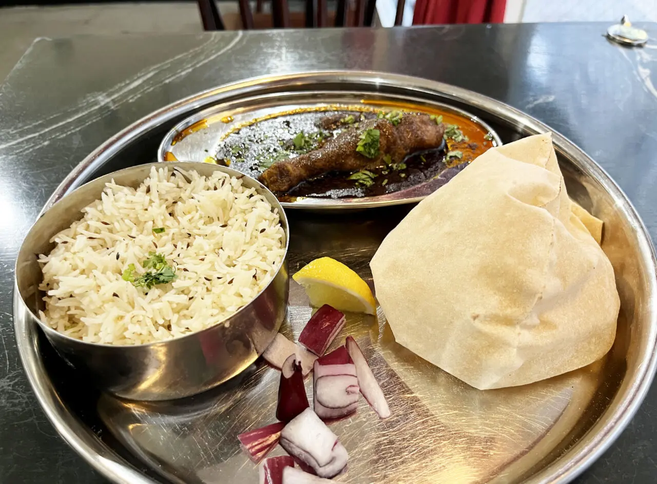 「サオジチキン」を注文してみました!ふわふわの生地「ロティ」とクミン入りライスの「Jeera Rice(ジーラライス) 」、また箸休めに最高なシャキシャキの紫玉ねぎが入っています。
