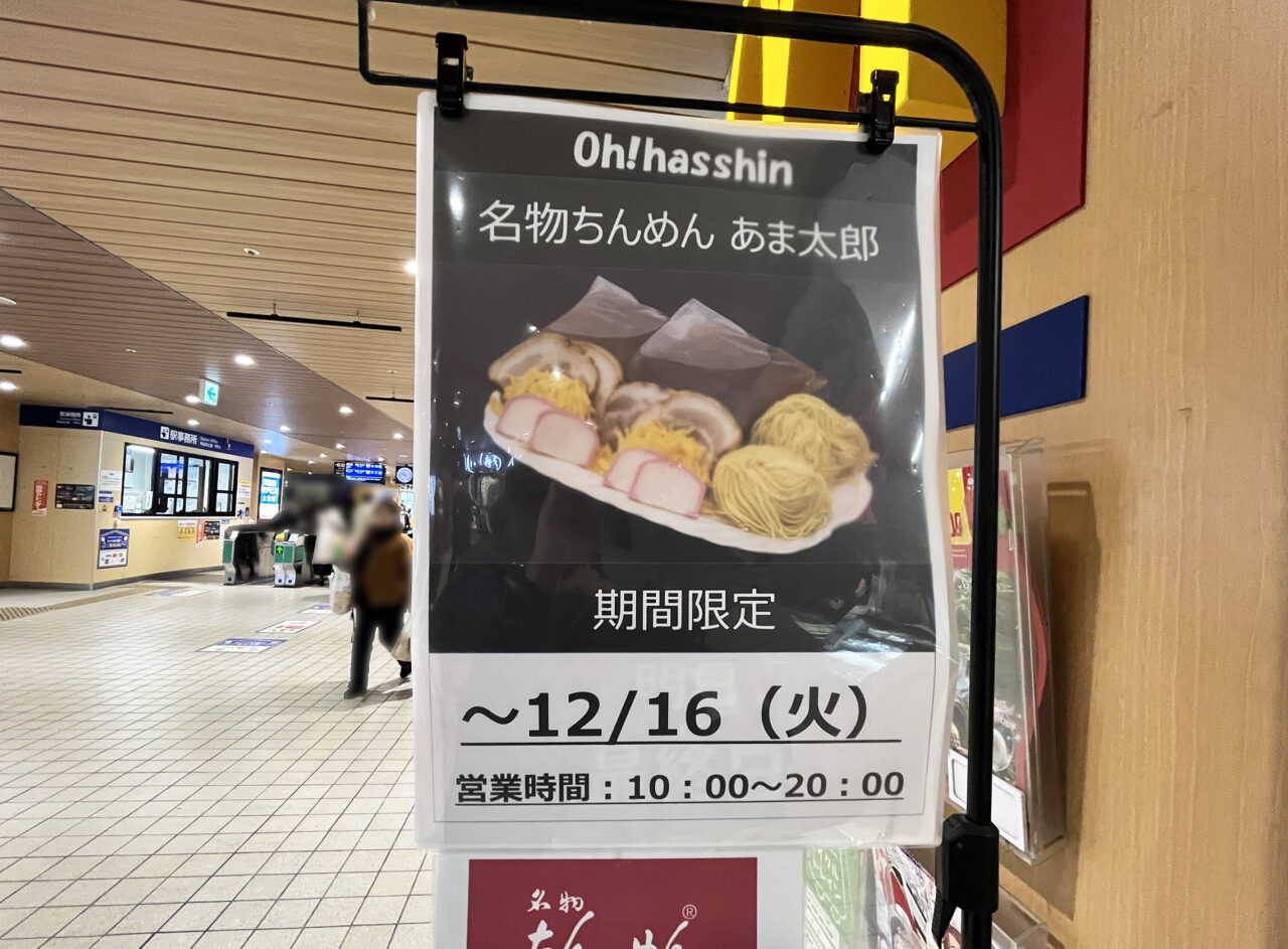 レイリア大橋の「2F 中央改札口前催事スペース」にて、「ちんめんあま太郎」のお持ち帰り商品が販売されますよ! 出店期間は2025年12月9日(火)~16日(火)まで、10時〜20時で営業中です。