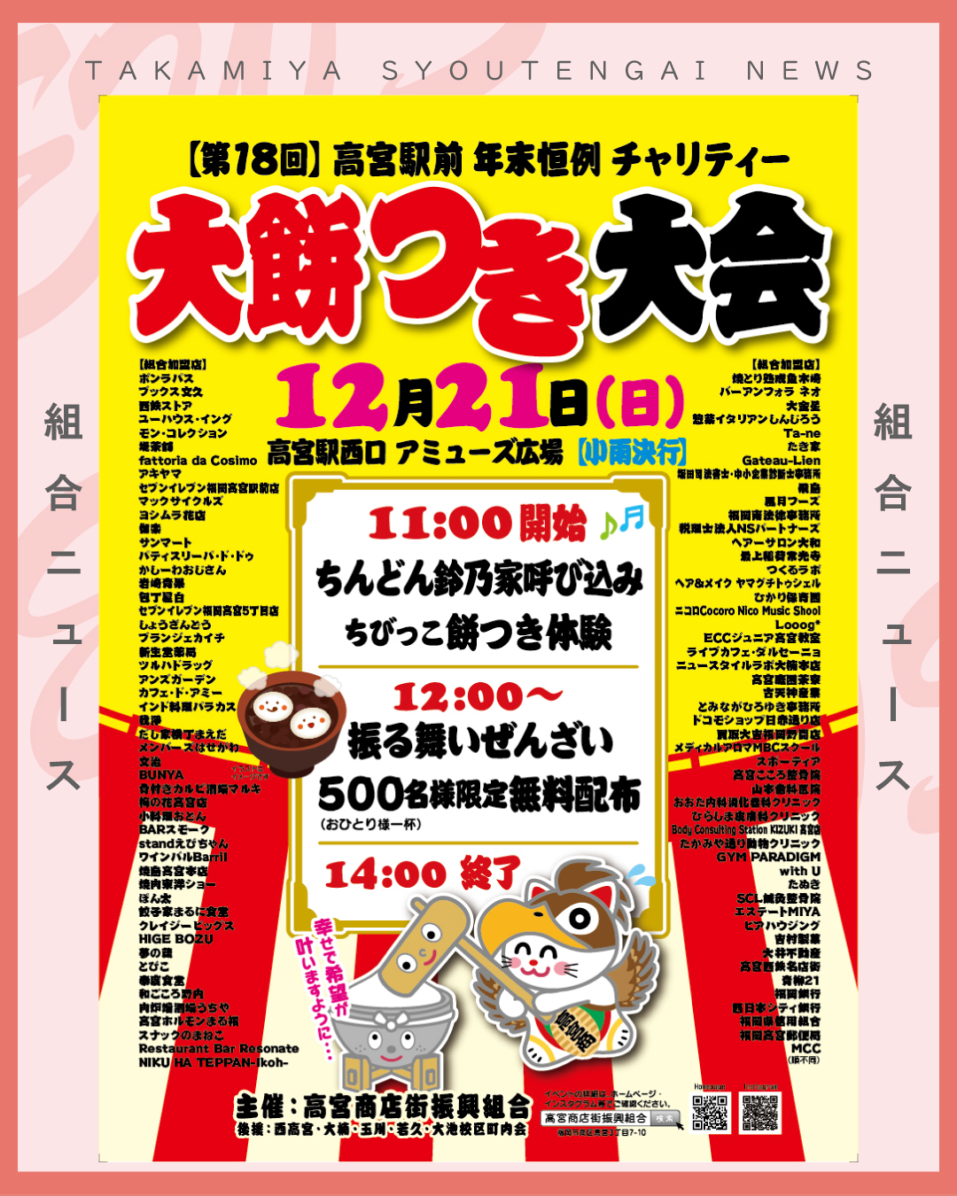 高宮駅前広場にて「第18回 高宮駅前大餅つき大会」が、2025年12月21日に開催されますよ~!