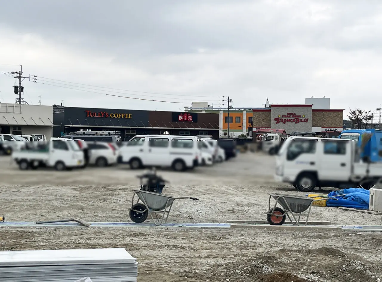 有名カフェや人気飲食店の看板がお目見えしていました。福岡市南区老司エリアからも好アクセス、約410台という広大な駐車場エリアになるということで、敷地もかなり広め。