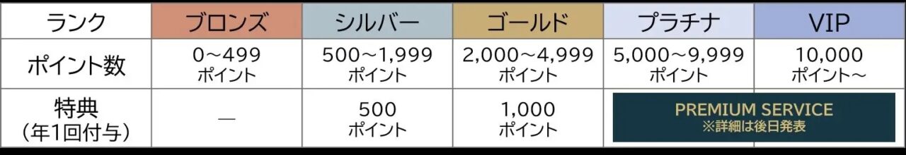 ・最新のキャンペーン情報の入手・参加応募が可能 - ランクアップ特典について:毎年4月~翌年3月の間に獲得したポイント数に応じて、翌年5月からのランクが決定。ランクに応じて、ポイントなどのランクアップ特典をプレゼント