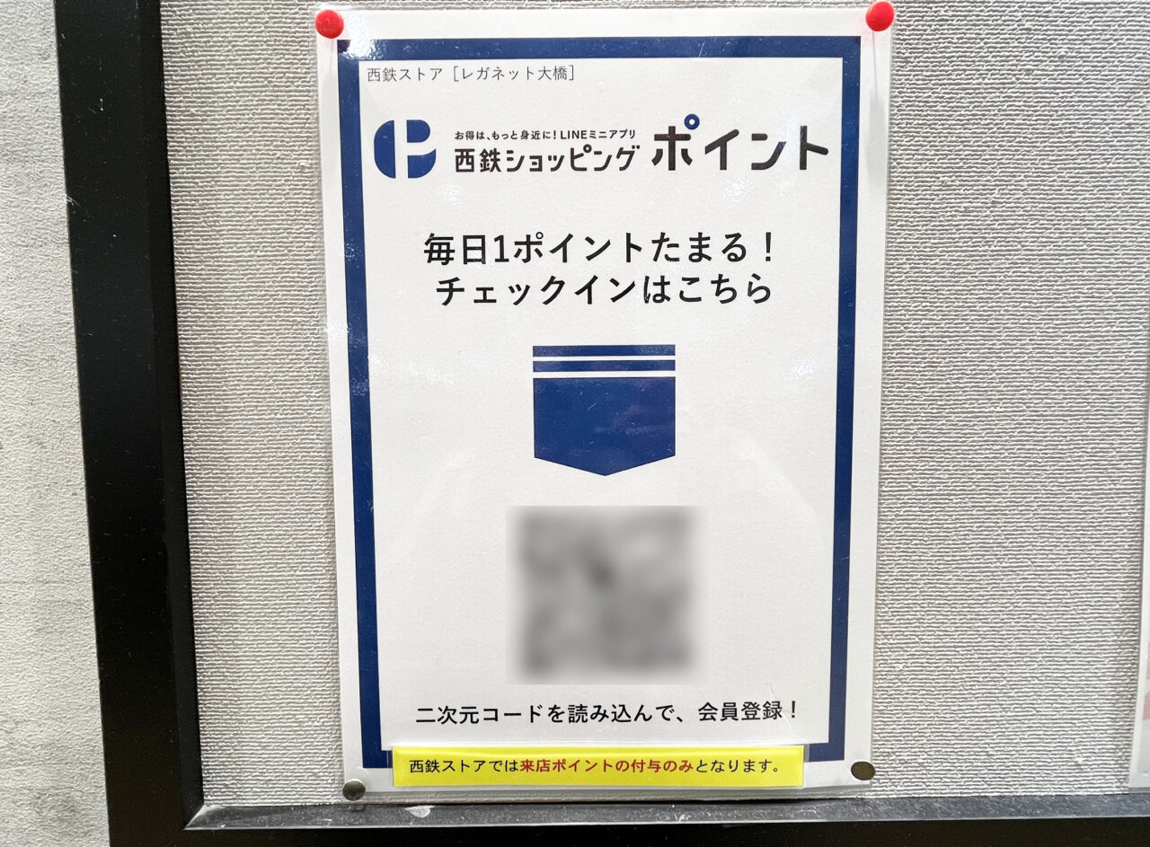 ちなみに大橋駅1Fの「レガネット大橋」ではショッピングポイントは付与されません(ポイント利用も不可)が、チェックインするだけの来店ポイントが1ポイント付与されます。