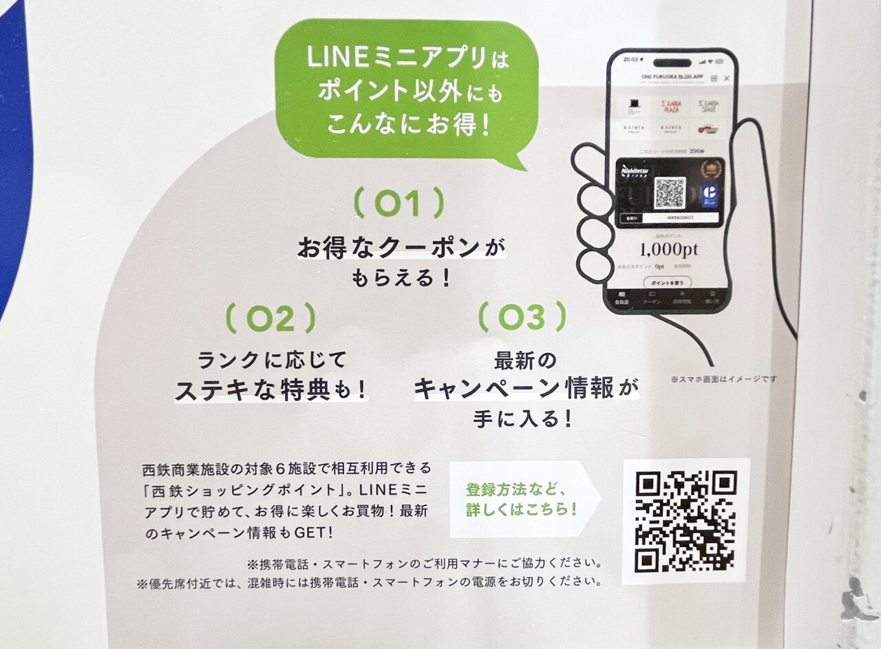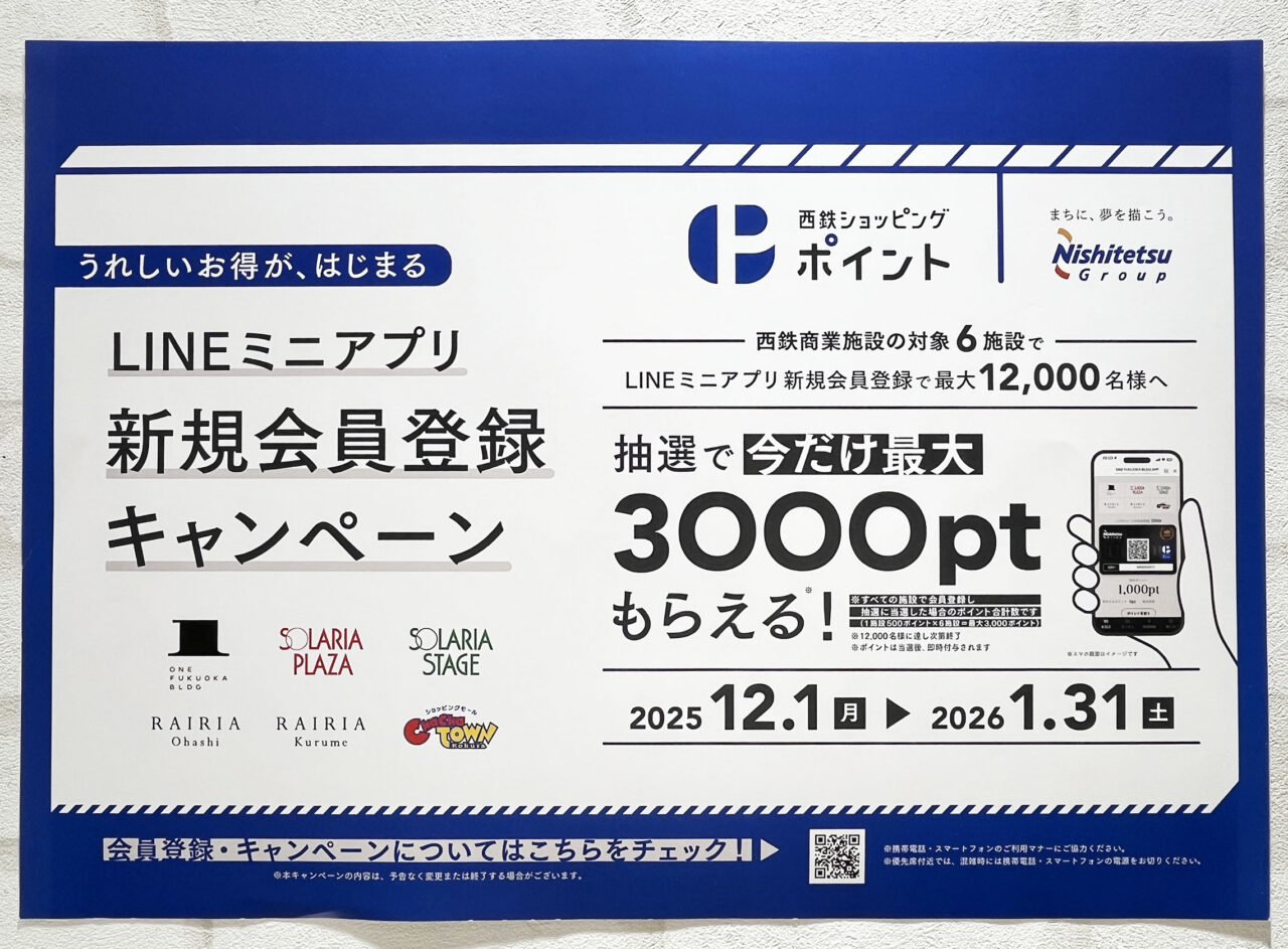 西鉄が運営する商業6施設(ONE FUKUOKA BLDG.、ソラリアプラザ、ソラリアステージ、レイリア大橋、レイリア久留米、チャチャタウン小倉)共通でためられる「お買い物ポイント」サービスが2025年12月1日よりスタートしています。「LINE」上で利用可能な「LINEミニアプリ」を使用するので、友だち追加をするだけであらたなアプリ導入は不要なんです。