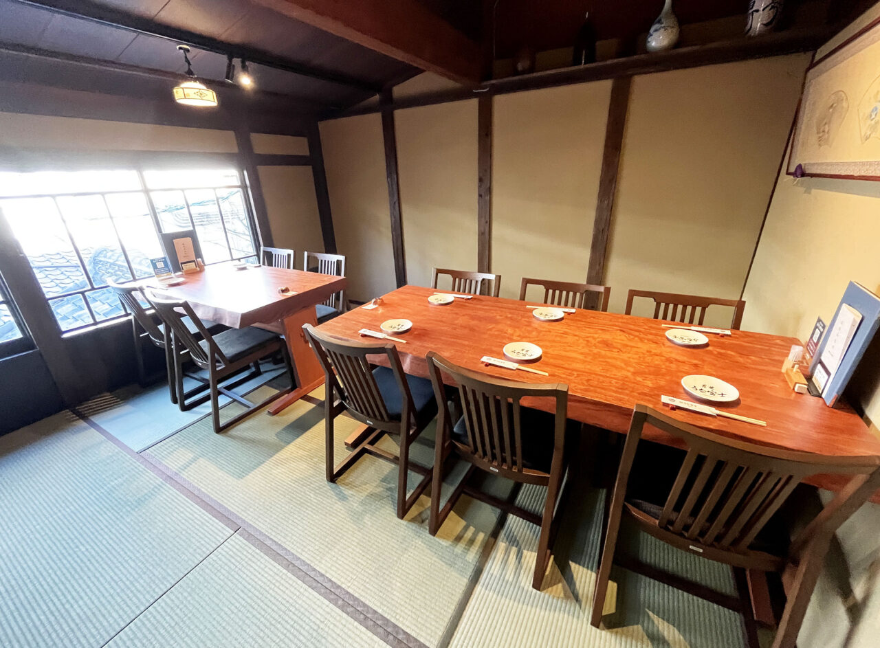 そのほか1階にはテーブル席が多数並ぶエリアも。2階へ続く階段を上がると畳式の個室なども完備。都市のにぎわいの中でも非日常を感じられるしっとりと落ち着いた空間となっています。