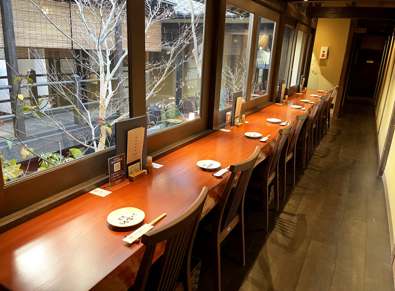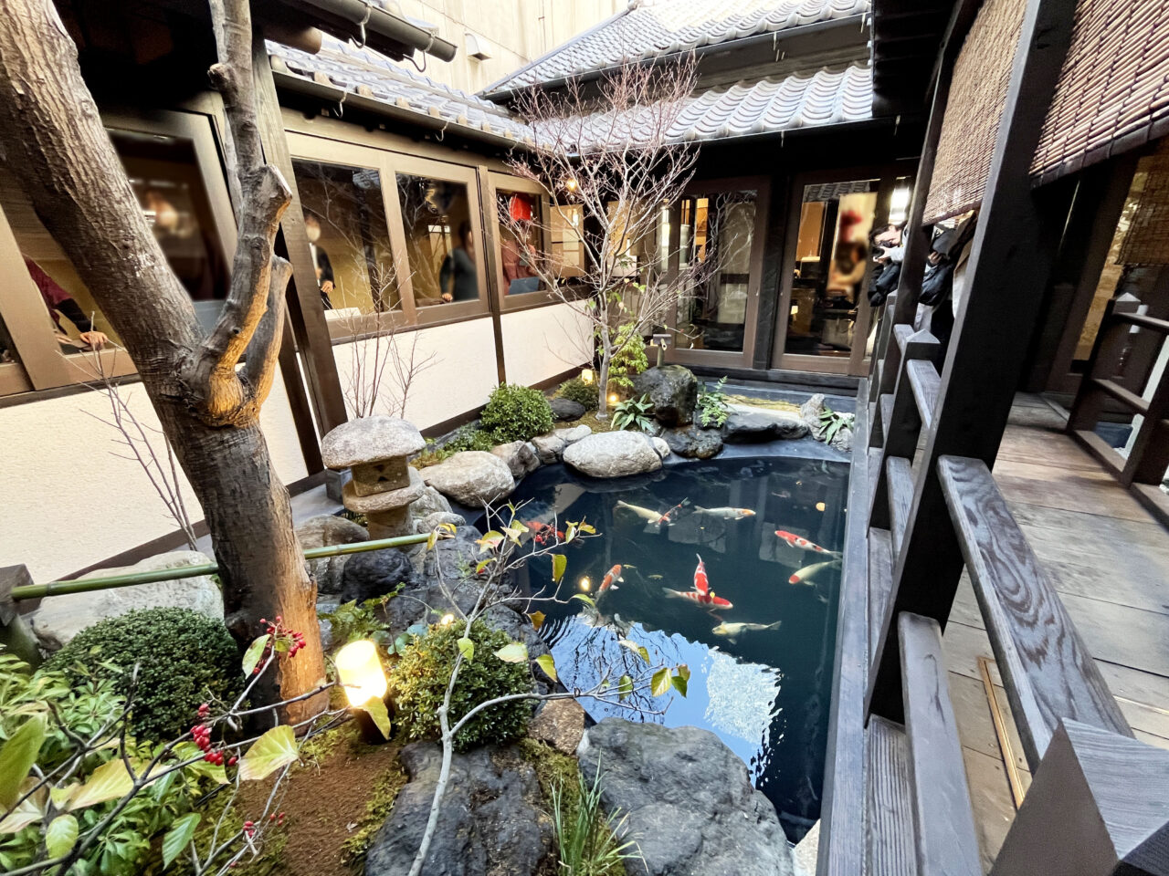 中庭には鯉が泳ぐ池も見え、和風建築の静の佇まいを感じます。カウンター席からは窓越しに池の景色もお楽しみ頂けます。