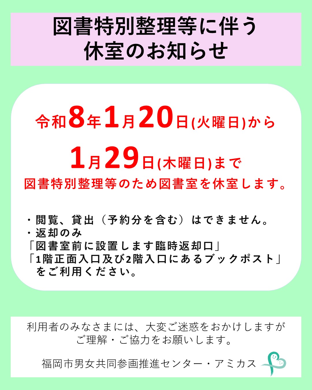 「アミカス 図書室」図書特別整理等のため図書室を休室