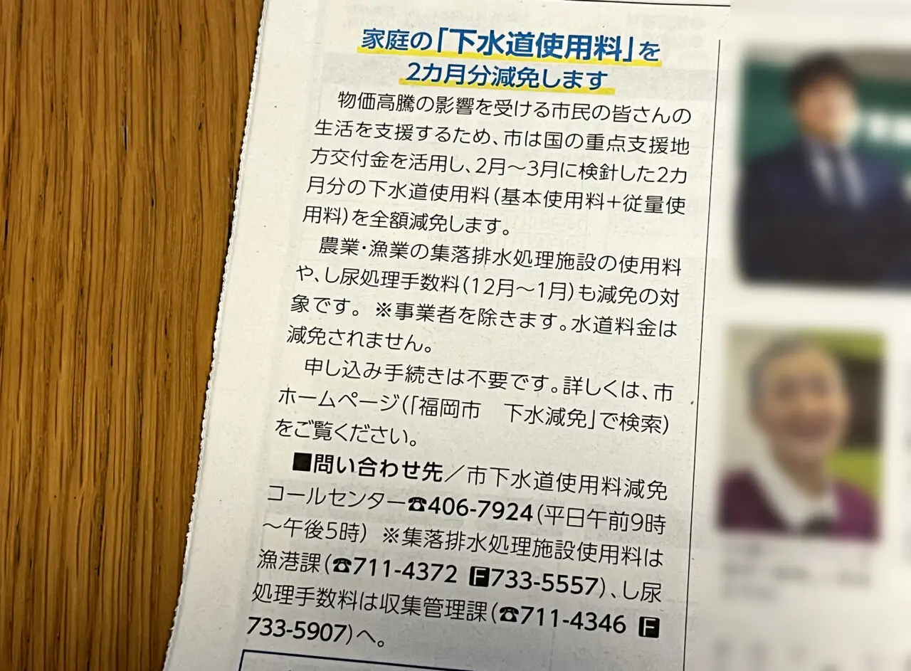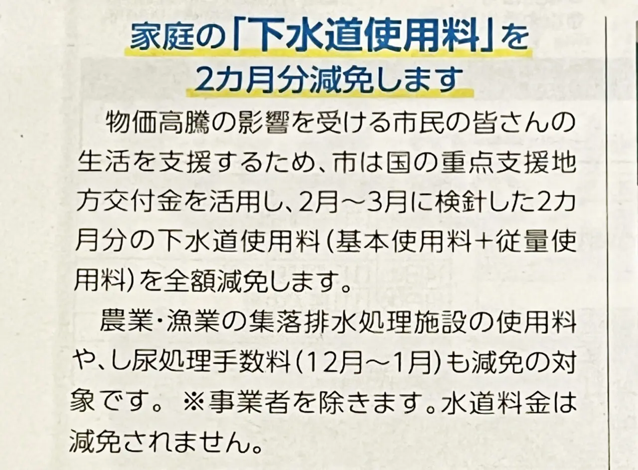 「下水道使用料の2か月分無料化」のお知らせも市政だよりに掲載されていました。
