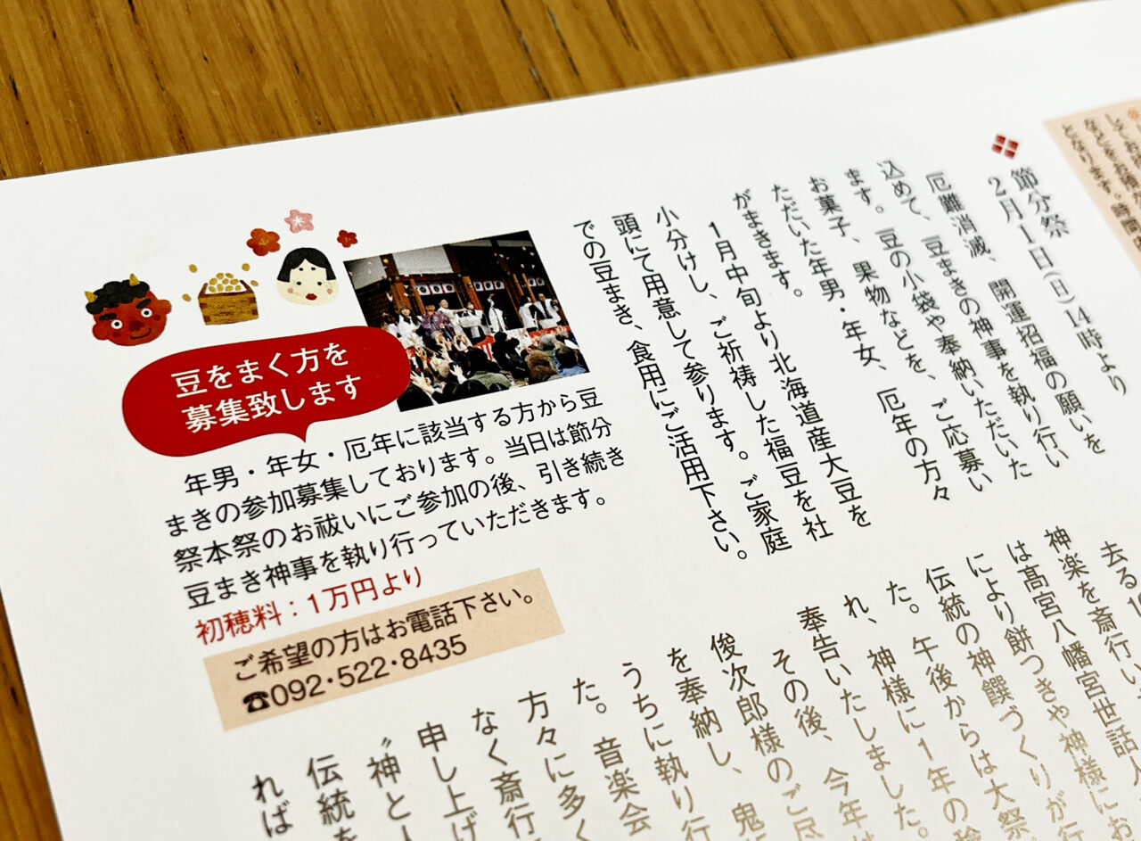 【福岡市南区】「高宮八幡宮」では厄難消滅・開運招福の願いを込めた「節分祭」が2月1日に行われます