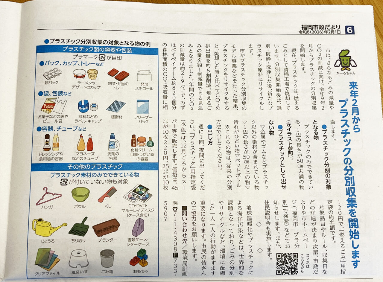 福岡市では現在、プラスチックは家庭用「燃えるごみ」で収集されていますが、いよいよ来年2027年2月より「プラスチック」の分別がスタートするとお知らせされています。
