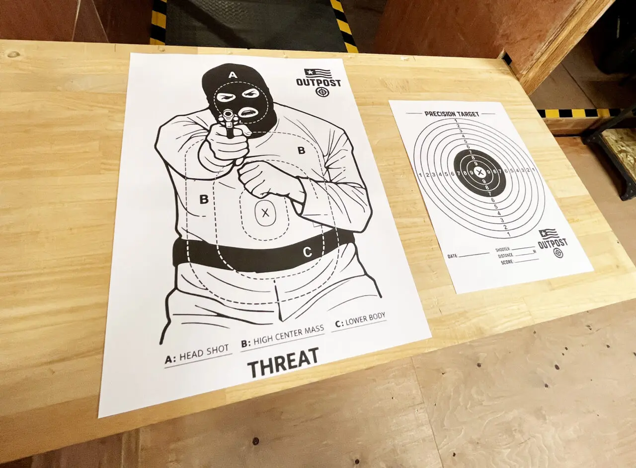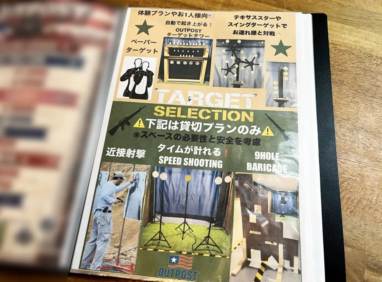 シューティングレンジご利用の方は、1枚ペーパーターゲット付きです。同店オリジナルのA4サイズやA3サイズなどの「ターゲットペーパー」が3種類あり、その中から選べます。