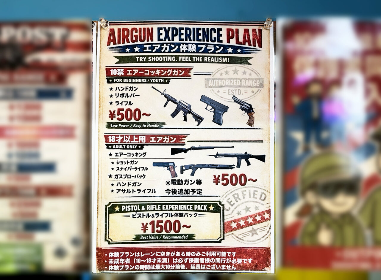 レーンに空きがある場合、 簡易的に「お試し」ができるプランで、撃ちたいエアガンを1回いくら〜といった体験プランです。