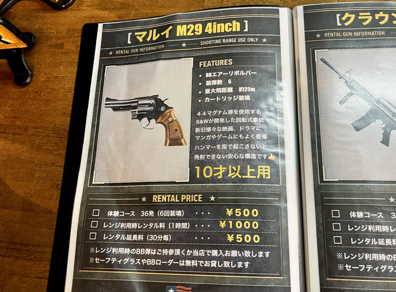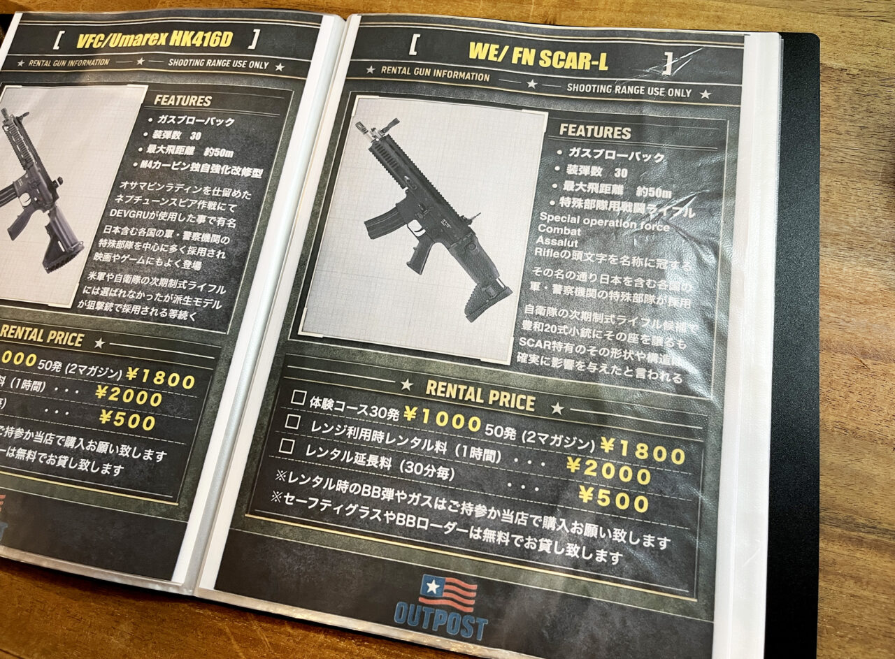 エアガンのパンフレットも置かれているので、色々見ながら選べます。使用年齢に応じてレンタルするエアガンを選ぶだけ!10歳以上用は現在3種類を提供されています。料金は1時間毎でBB弾の玉数に応じた利用料金となっています。