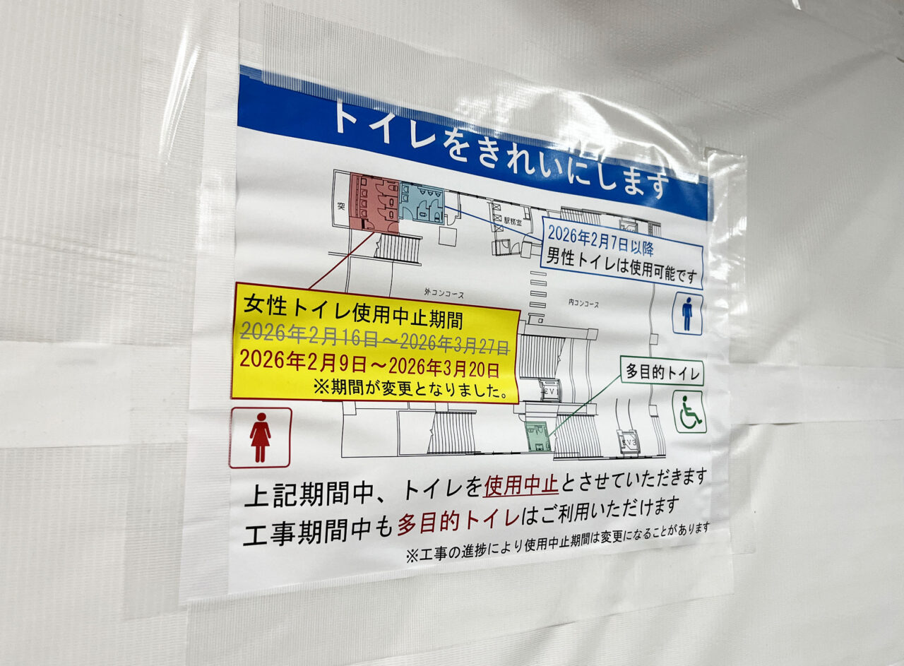 高宮駅改札前にあるトイレもキレイに! 現在女子トイレは改修工事中のため使用不可で、2026年3月20日までは使用できない模様です(進捗状況によっては延長の可能性もありとのこと)。ちなみに工事期間中、男性トイレや多目的トイレの使用は可能ということです。