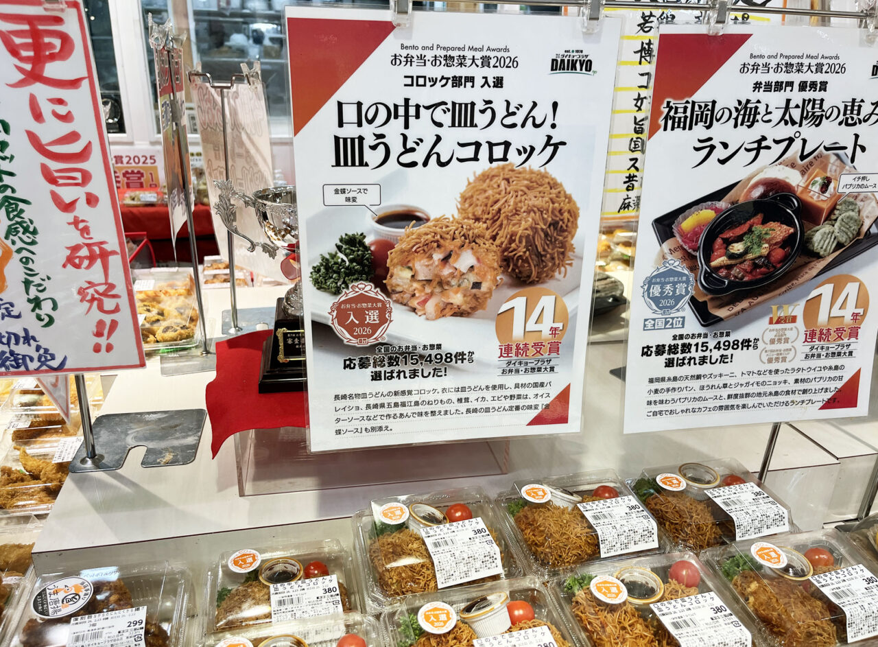 「ダイキョーバリュー弥永店」のさまざまなお弁当やお惣菜が並ぶお惣菜コーナーでは週末を中心に、入賞作品が並ぶ「お弁当お惣菜大賞フェス」が開催中。「皿うどんコロッケ」もたくさん販売されていますよ。