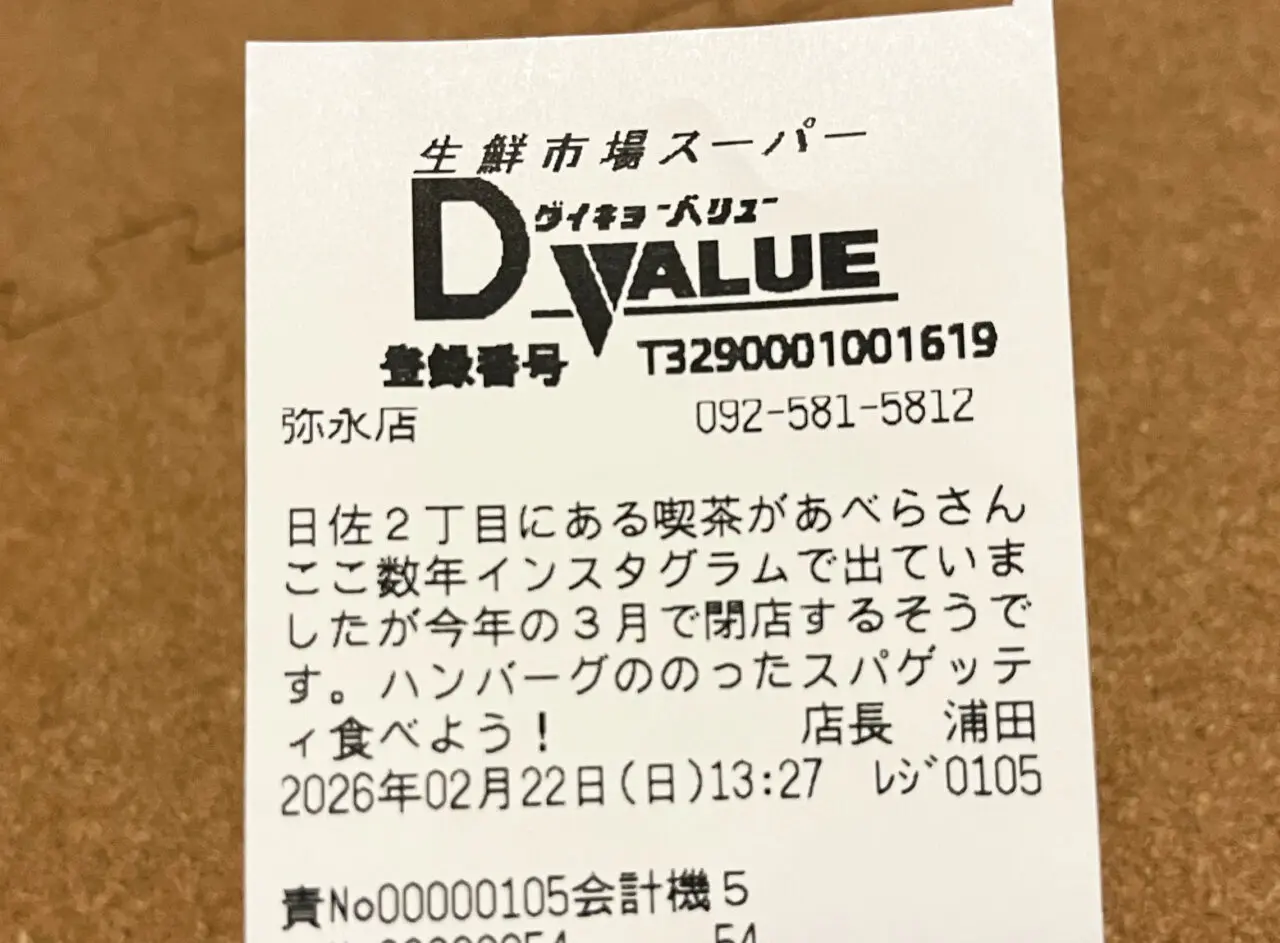 「ダイキョーバリュー弥永店」のレシートにはいつも浦田店長さんからの楽しいお知らせやメッセージが書かれていますが、先日買い物して見たレシートに衝撃の情報が…。なんと「お食事と喫茶 があべら」が3月で閉店するそうです…。