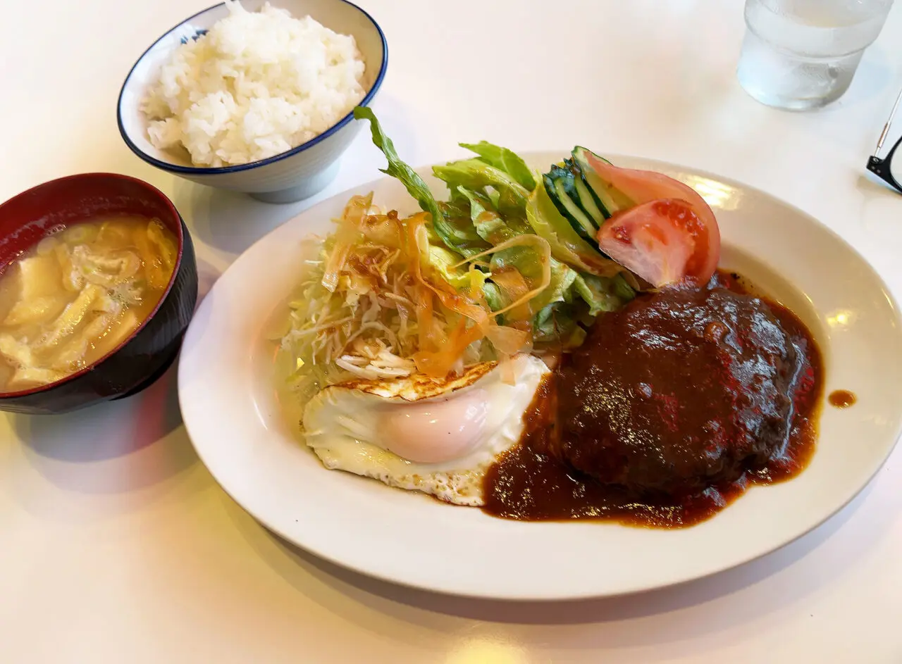 「手作りハンバーグ定食」にしてみました。ふわふわ食感のハンバーグはデミグラスソースと半熟の玉子が一緒に味わえる最高の組み合わせ♪ 手作りのハンバーグにはやさしい味わいが感じられ、付け合わせのサラダも最高でした♪ お腹いっぱいになりました。