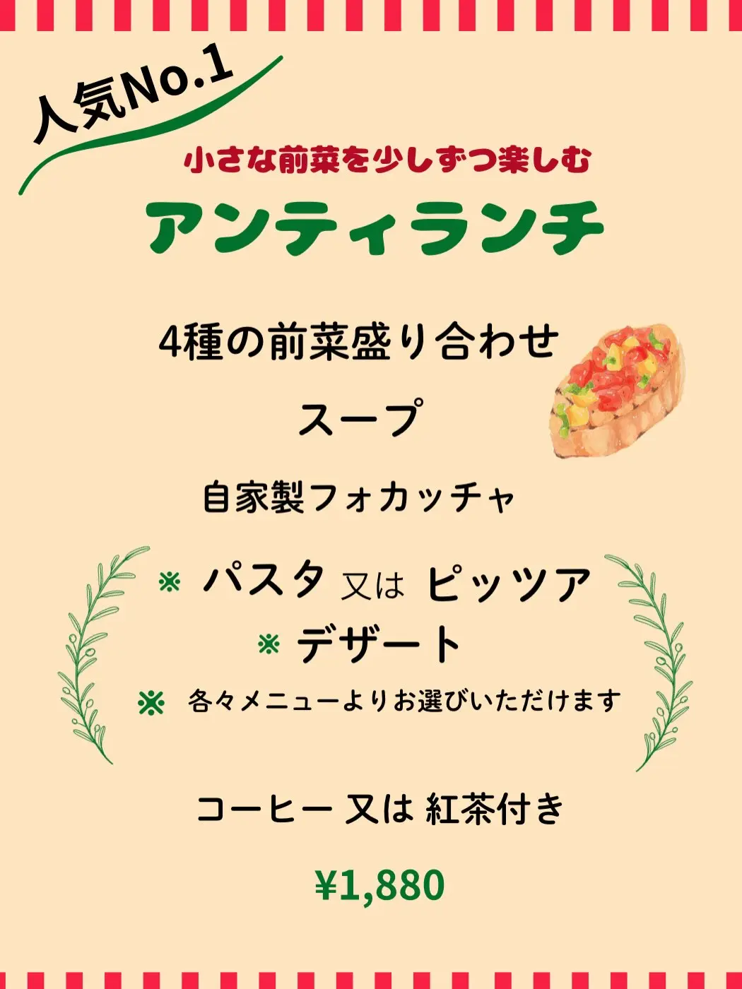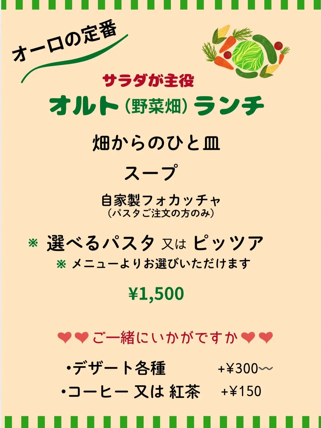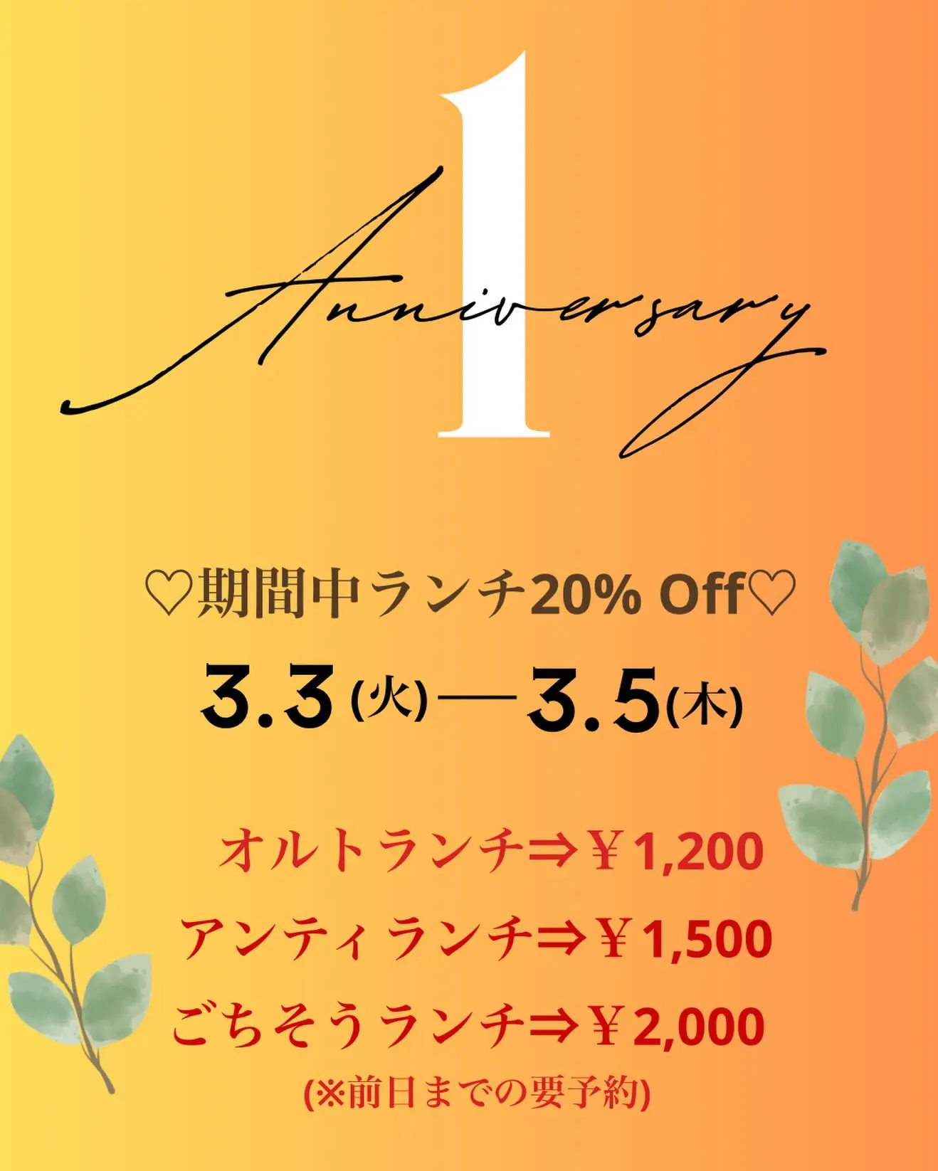 通常税込1500円の「オルトランチ」が1200円に、通常税込1880円の「アンティランチ」が1500円に、通常税込2500円の「ごちそうランチ」が2000円になるおトクな期間となっています♡