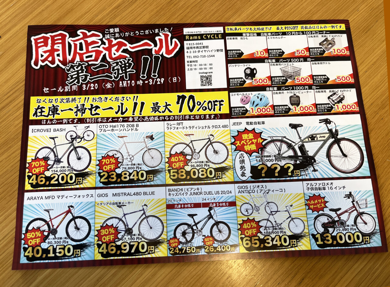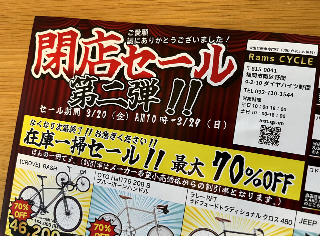 【福岡市南区】野間大池近くにある自転車店「サイクルショップRams.」が閉店するという情報提供。閉店セール実施中です