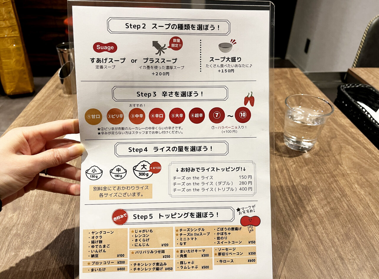 スープの種類や辛さ、ライスの量もお選び頂けます。お好みでトッピングなども可能です。