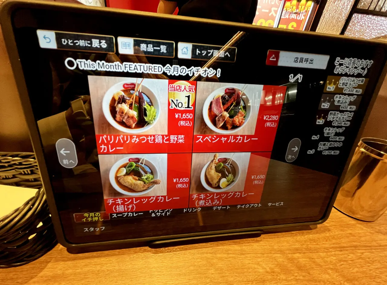 メニューは全部で11種類ほどあり、焼きや揚げ、煮込みから選べるチキンレッグカレーや豚しゃぶカレーや牛ロースカレーなど幅広いラインナップからセレクトします。