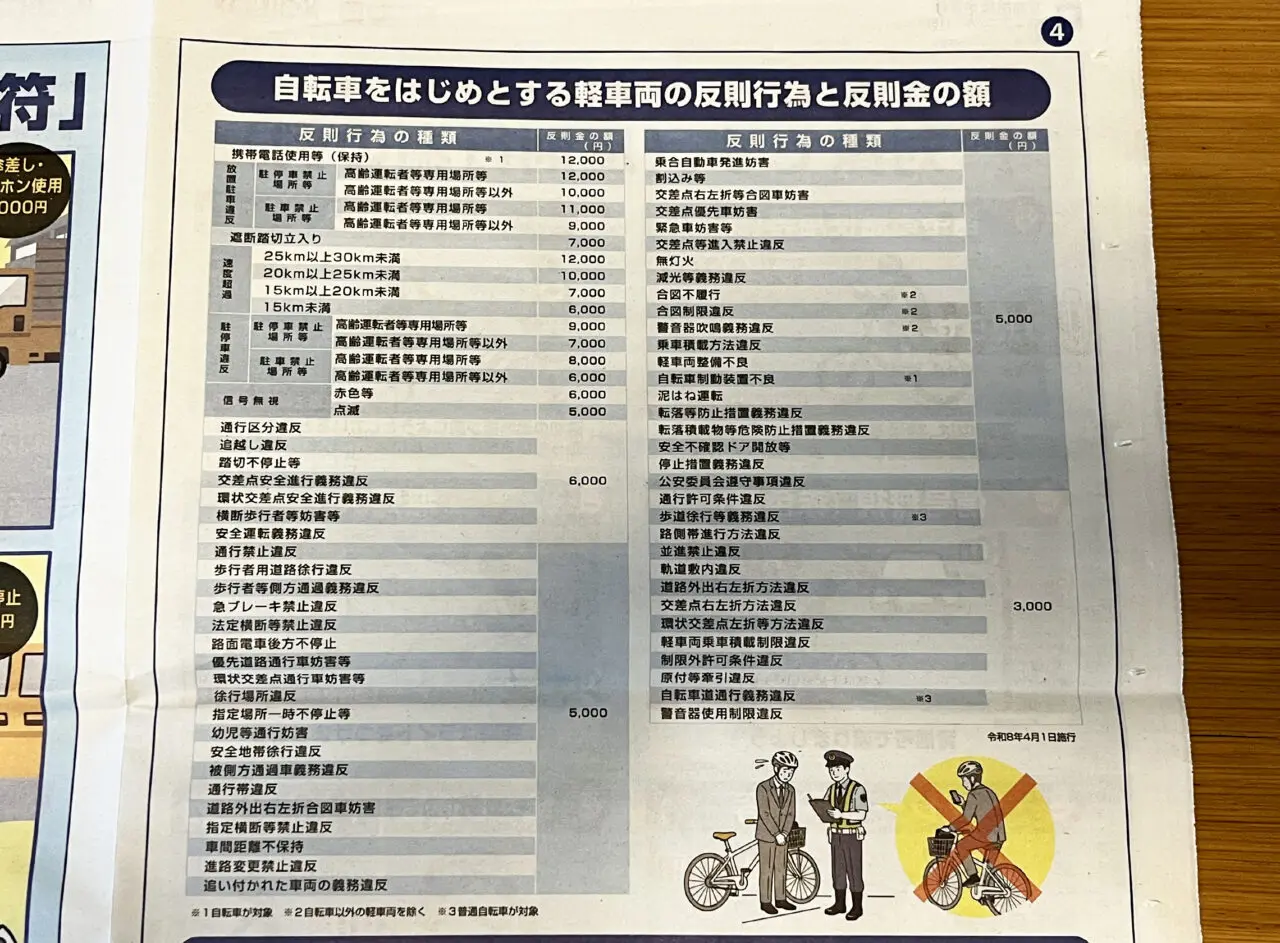 2024年11月より「道路交通法」が改正され、自転車関連の罰則が強化されましたが、2026年4月からは反則金が科せられる模様です。