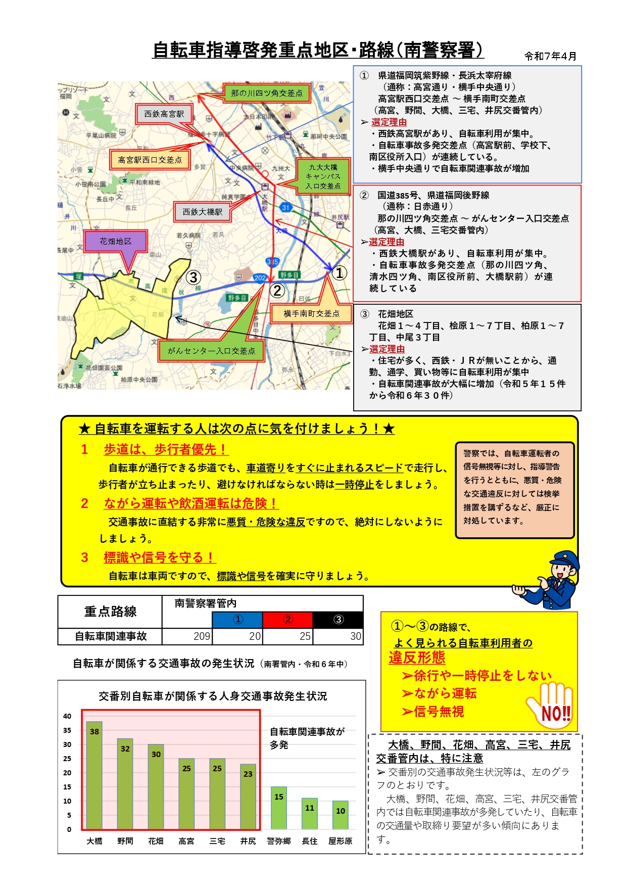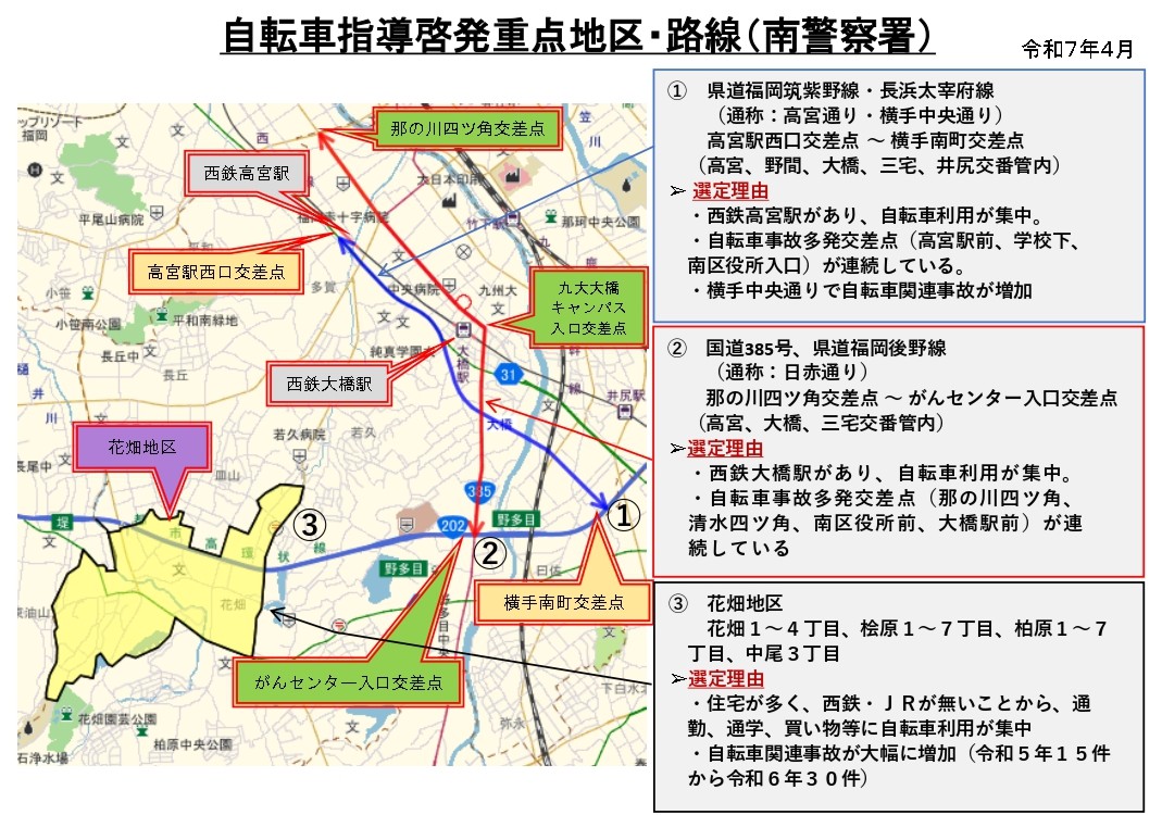 福岡市の公式サイトでは「自転車指導啓発重点地区・路線」が掲載されており、自転車が関係する交通事故の発生状況等をふまえ、市内では合計11地区・14路線が「自転車指導啓発重点地区・路線」として選定されている模様です。南区の該当エリアも掲載されており、福岡市では、福岡県警察等の関係機関と連携した自転車指導啓発重点地区・路線での啓発活動が推進されています。