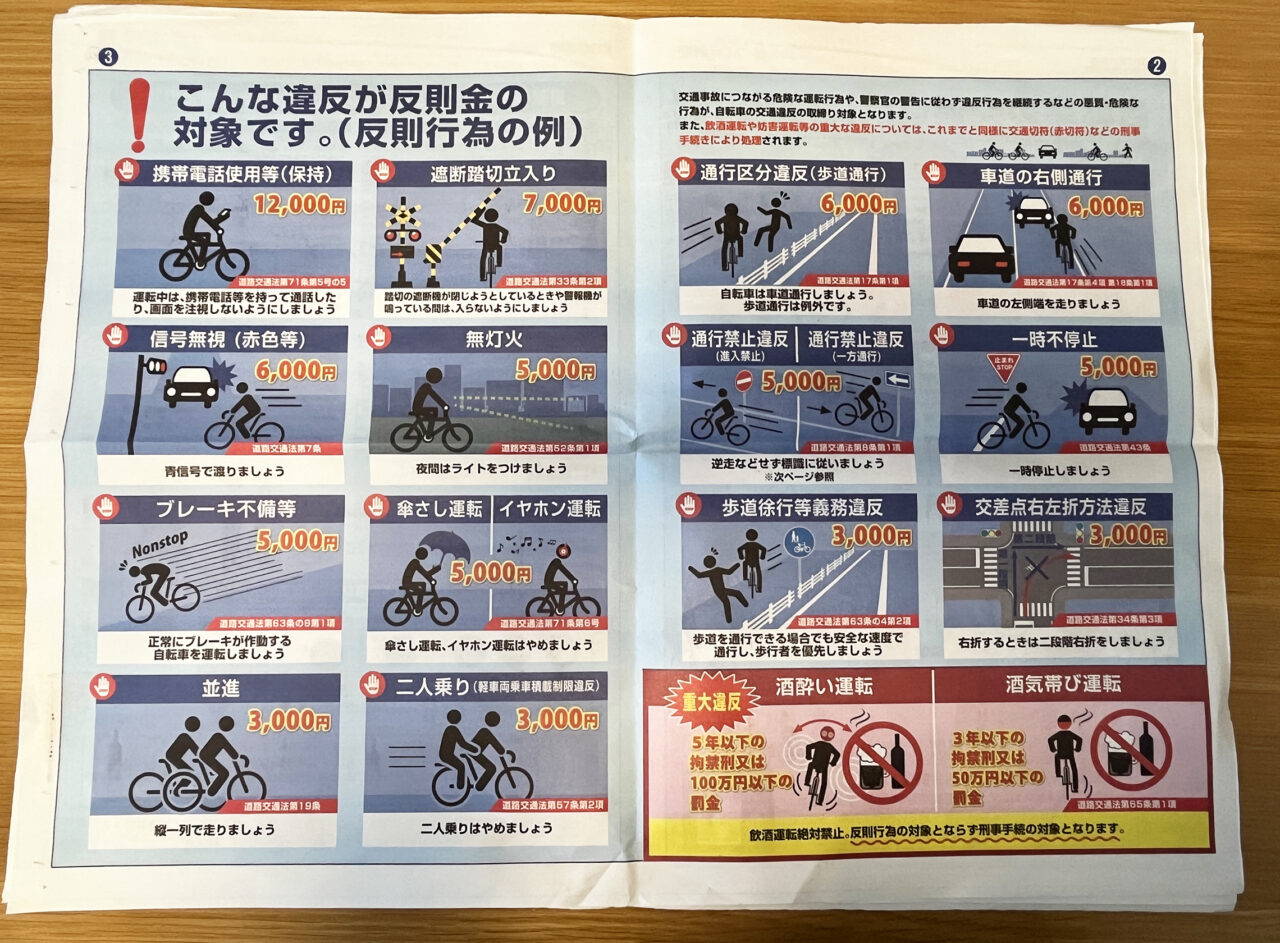 2024年11月より「道路交通法」が改正され、自転車関連の罰則が強化されましたが、2026年4月からは反則金が科せられる模様です。