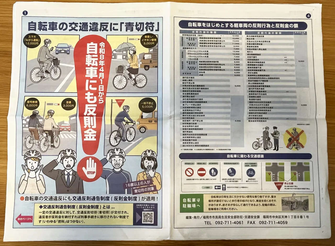 2026年4月1日より「自転車にも反則金」とテレビなどのメディアで話題になっていますね。福岡市では、市政だよりに4面にもわたってお知らせが掲載されていますね。自転車利用者にとっては一大事。「具体的にどうなるの?」と不安な方も多いのではないでしょうか。